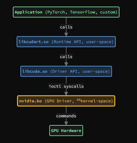 “Driver” 可指 (OS)kernel 空间的驱动(如 nvidia.ko)或用户空间的 Driver API 库(如 libcuda.so)。