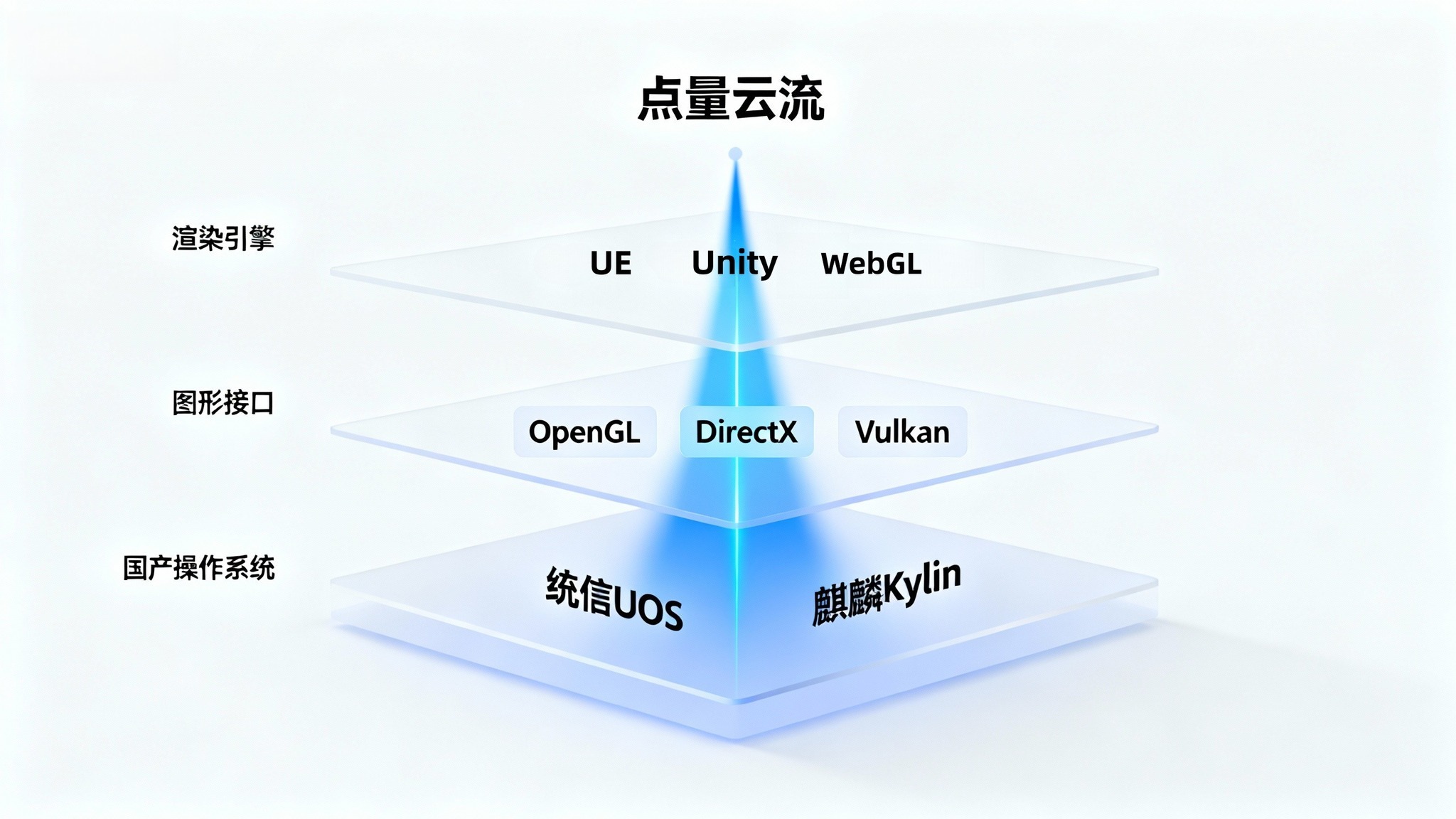 在操作系统层面,点量云流已完成与统信 UOS、麒麟 Kylin 等主流国产操作系统的全面适配。在图形接口方面,全面支持 OpenGL、DirectX、Vulkan 等主流图形接口标准。同时,确保了 Unreal Engine(UE)、Unity3D、WebGL 等主流渲染引擎的顺畅运行,保障了现有数字内容的无缝迁移与稳定呈现。