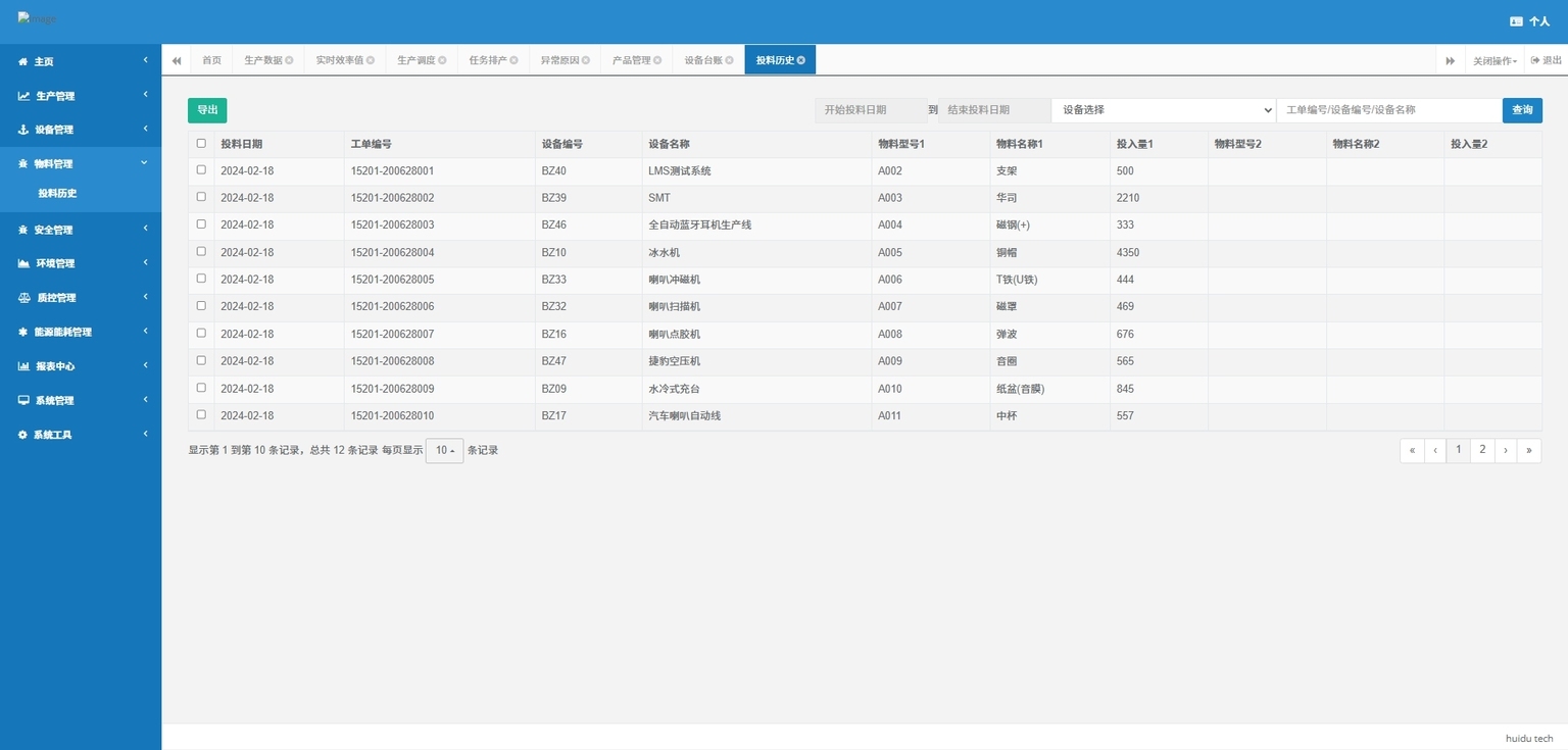 投料历史:记录物料的投入历史,用于生产成本分析和物料管理,实现物料投入的可追溯与成本管控。