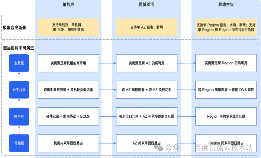 百度智能云混合云 ABC Stack 高可用方案,通过一套统一架构,实现从单机房到多可用区,再到多地域的无缝扩展。其核心是构建一套覆盖底层基础设施到上层业务应用的全维度保障体系,贯穿传输、网络、云平台和业务层,实现从单机房、到同城多可用区( AZ )、再到两地三中心(多 Region)的全阶段演进。