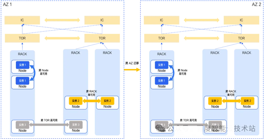 在算力调度方面,业务层通过多实例的离散部署,实现业务实例跨节点、跨机柜、跨交换机乃至跨 AZ 的分布式落位,从而保障业务在不同范围的单点故障下仍具备高可用能力。这一点与云服务的离散部署理念一致,都是通过跨域分布来提升业务韧性。