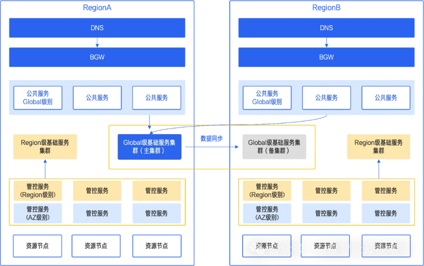 服务与实例部署:通过统一云管平台完成服务和实例的规划落位。Global 级别的服务及其数据会被重部署至多 AZ、多 Region 中,由主 Region 提供服务;Region 服务 和 AZ 服务保持原有服务落位,保证主 Region 的每个 AZ 均可提供服务。