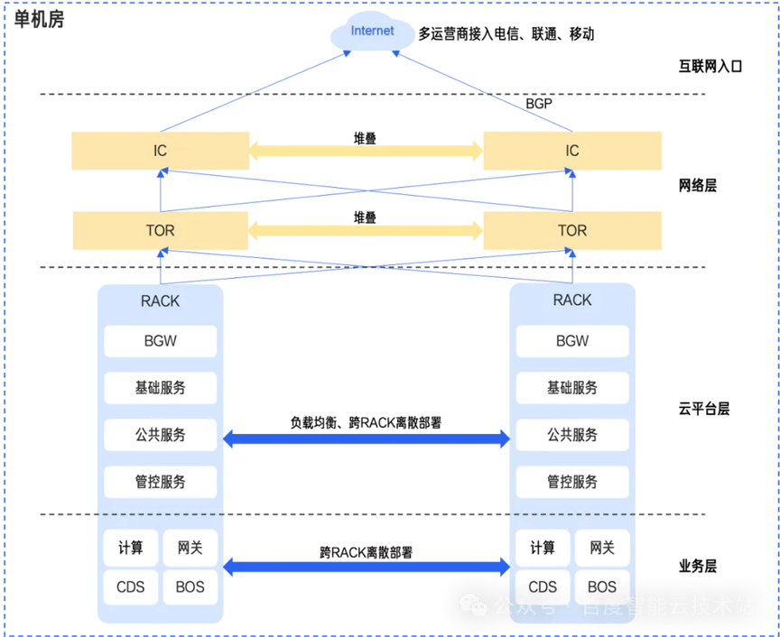 网络与传输冗余:线路、板卡、设备全冗余,通过「双平面四路由」、交换机堆叠与 BGP 路由,实现数据通信的高可用切换。