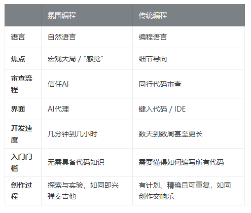 传统上,编程过程非常结构化和有条不紊,而氛围编程描述的则是一种更具创造性或基于流程的方法。以下是这两种方法差异的细目分类: