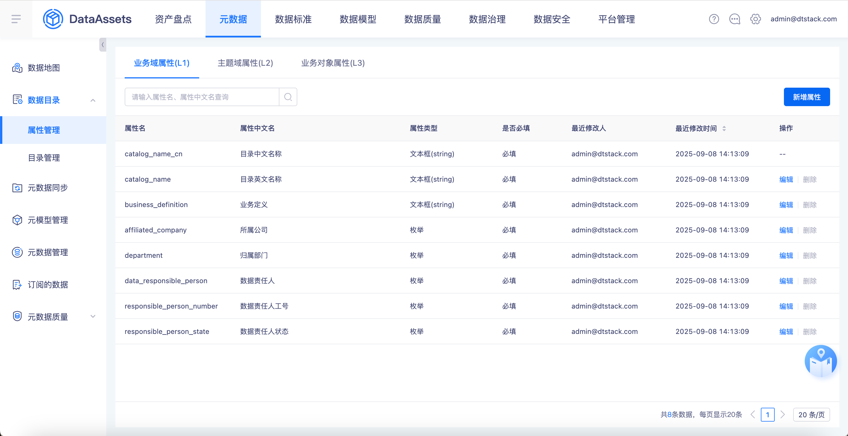 通过平台可定义每层目录的属性信息,实现目录信息的自定义管理。企业可根据自身业务要求设置不同层级目录需要维护的业务属性,例如业务域所属部门、业务域维护责任人等,支持设置每个属性的维护方式、是否必填,灵活控制目录属性。