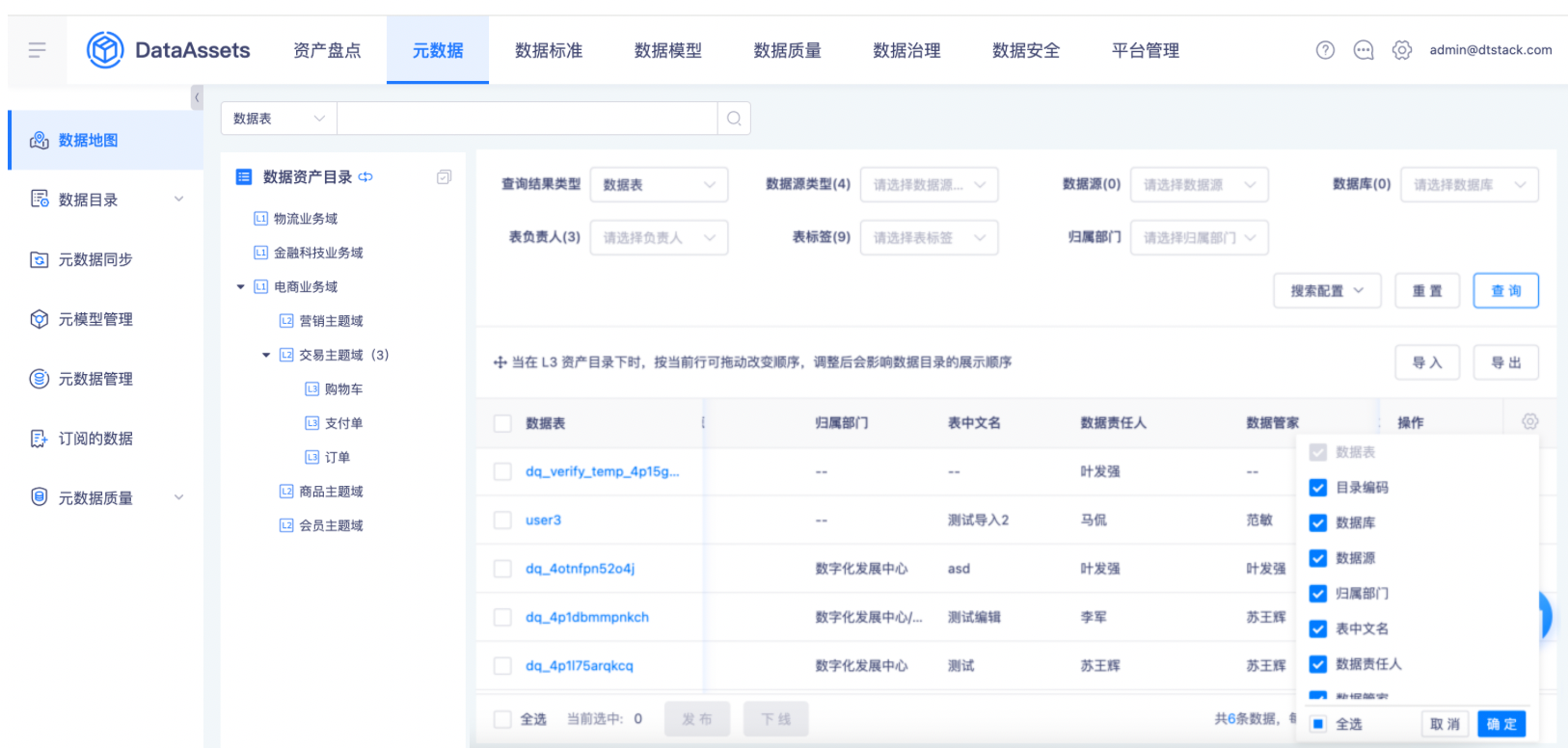 实现对业务域、主题域、业务对象、逻辑实体、属性五个层级的分层架构管理,企业用户可根据自身业务要求定义层级之间的级联关系,维护每个层级对应的业务属性信息。同时考虑某个业务域下的实体表数量庞大,平台提供整库发布、批量发布功能,便于用户初始化配置资产目录结构,快速完善企业数据资产架构。
