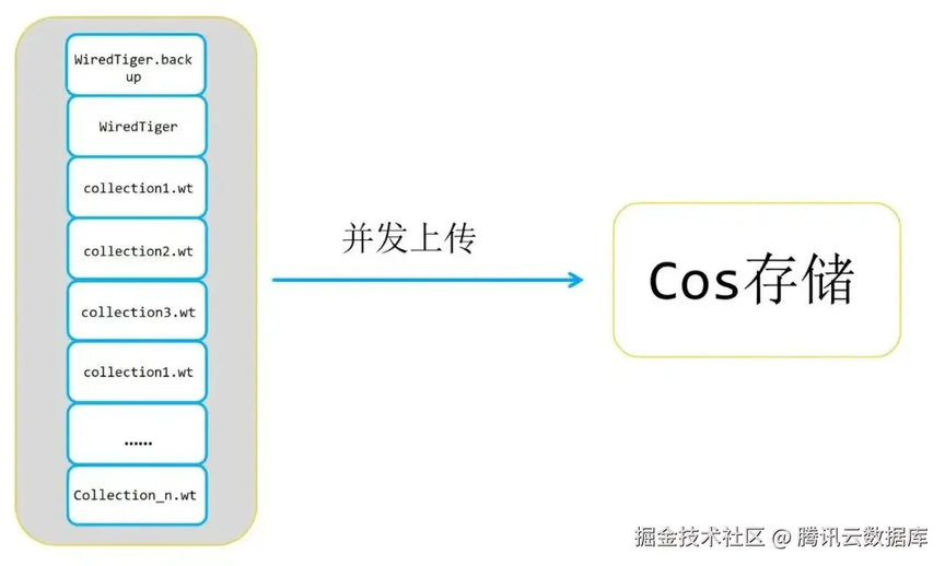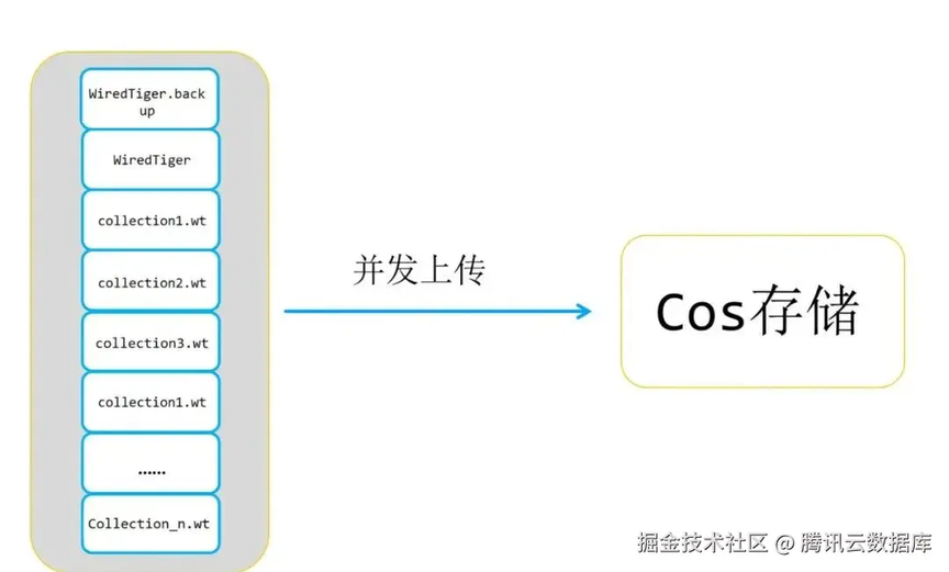 获取到需要备份的 wt 文件后,旁路服务就可以并发拷贝 wt 文件存储到腾讯云 cos 对象存储中(包括 WiredTiger.backup 文件)。