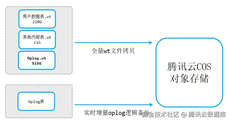 从上面的备份和回档流程可以看出,全量物理备份的时候我们需要拷贝 oplog.wt 到 cos , 下载的时候也需要从 cos 下载这个 oplog.wt 文件。