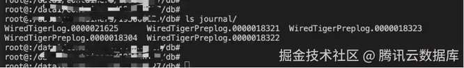 基于以上背景,因此就有了 WAL 模块的存在,在数据写入到 B+ tree 前,会提前写 WAL 日志,每个写事物对应一个完整 wal 日志,这样当服务器异常重启或者进程重启的时候,就可以通过 WAL 顺序回放这些日志完成数据恢复。Mongod 的 WAL 数据存储在 journal 目录中: