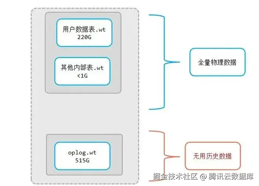 线上有部分 MongoDB 业务,因其业务独特性产生了海量的非结构化数据(如游戏日志、用户行为记录等),常面临文档大、更新写入频繁的挑战。为了存储足够的 oplog ,运维人员往往需要将 oplog size 设置得比较大,甚至远远超过了业务数据本身的大小。MongoDB 物理备份基于 wiredTiger 存储 backup 功能实现,该功能主要拷贝数据目录中的所有 wt 文件,包括用户数据文件、oplog 、系统 wt 文件等。
