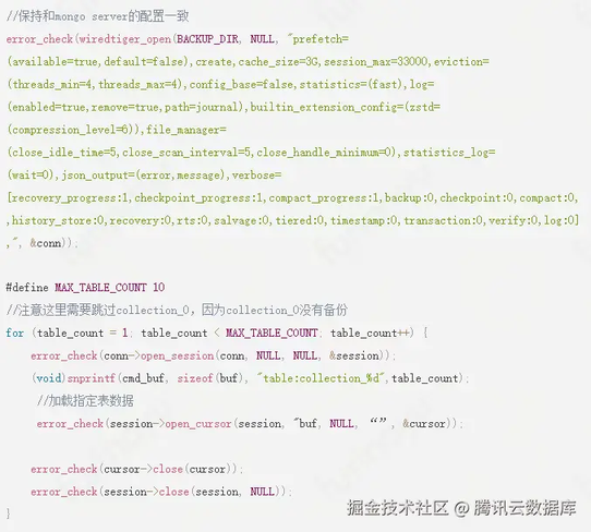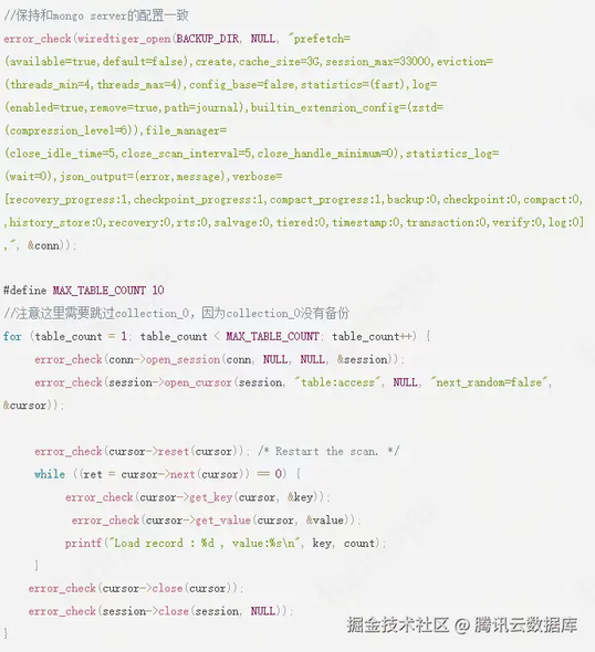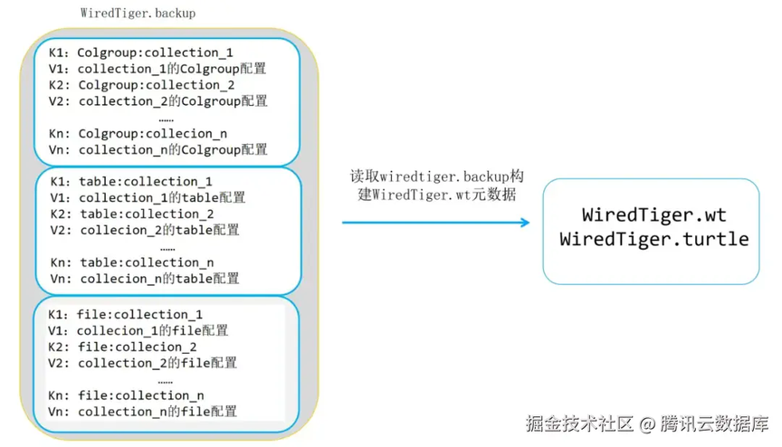 数据恢复实现主要是读取 WiredTiger.backup 内容,然后根据这些内容生成 WiredTiger.wt 元数据文件,元数据文件生成完毕后就可以开始正式数据加载,mongod 即可通过 WiredTiger.wt 元数据文件获取每个表的配置信息,从而完成 wt 加载启动工作。
