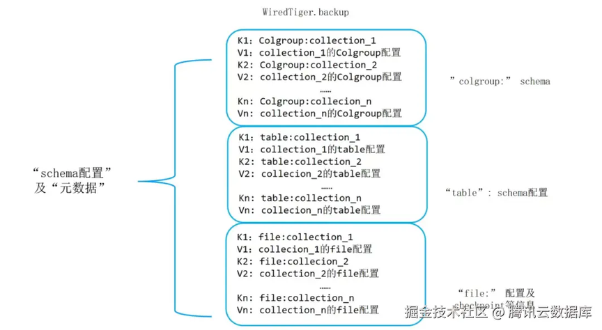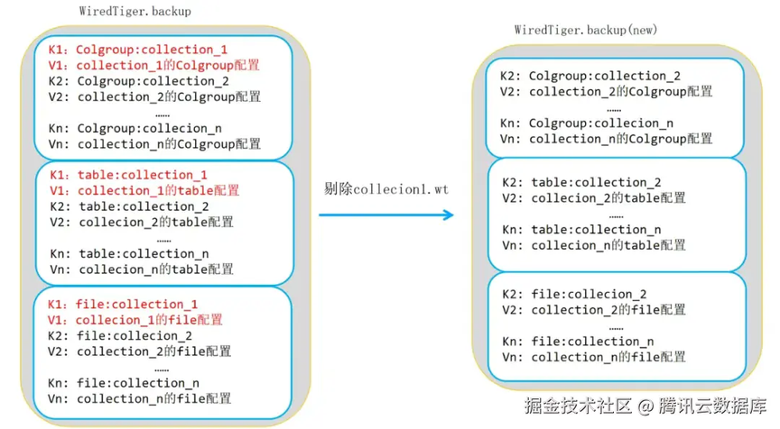 从上面的备份和恢复方式可以看出,WiredTiger.backup 中的内容是节点恢复的核心关键元数据,wt 启动所需的 WiredTiger.wt 中的 schema 配置和元数据内容全部来自 WiredTiger.backup 文件,而 WiredTiger.backup 文件在 begin 阶段完成,因此可以在 wt 的 backup 接口中增加了一个 exclude_target 参数,这个参数的作用主要是在 begin 阶段排除指定 wt 文件。假设剔除的表为 collection1, Hotback begin 阶段剔除 collection1 表后,WiredTiger.backup 文件中的内容将不再包含 collection1 的相关内容(这里腾讯云自己对 wiredTiger 做了修改),如下图: