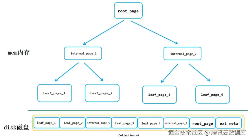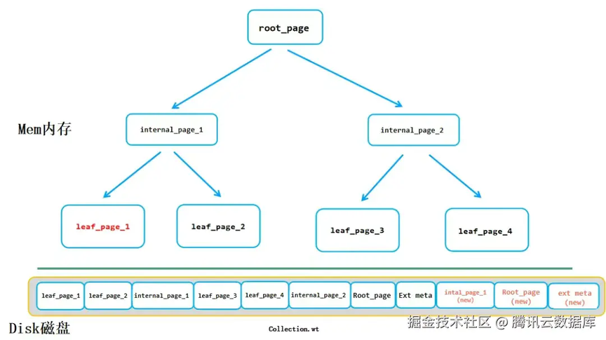 最终两次 checkpoint 后,collection.wt 中包含了两次 checkpoint 的全部用户数据和 ext 元数据,每个 checkpoint 都对应一棵完整的 b+ tree,假设第一次 checkpoint 对应 checkpoint_1,第二次 checkpoint 对应 checkpoint_2, 则: