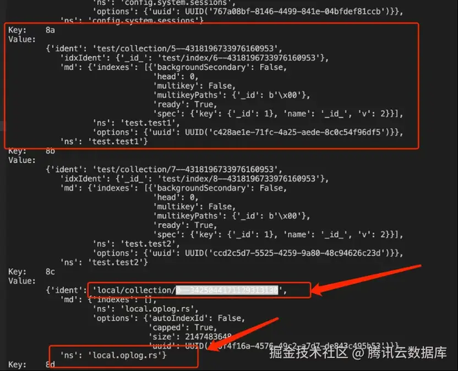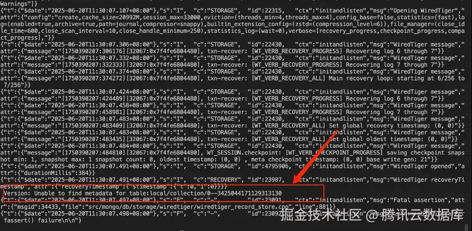 由于 wiredTiger 引擎侧我们通过 exclude_target 删除了 oplog.rs 表对应的 wt 文件,但是 mongo server 侧在 _mdb_catalog.wt 和 sizeStorer.wt 两个文件中维护着表、索引、数据量相关元数据。Mongod 启动的时候会加载这两个 wt 文件获取到对应的表,然后去检查这些表是否存在。由于 wiredTiger 引擎侧删除了 oplog.rs 对应的 wt 文件,因此 mongo server 侧检查不通过。
