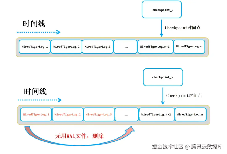 增量数据可以通过 checkpoint 时间点对应的 WAL 文件回放来完成,也就是图中的 WiredTigerLog.n-1 和 WiredTigerLog.n。