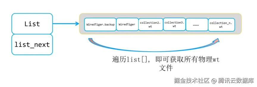 该阶段会从 WiredTiger.wt 中读取所有" file:"相关的 wt 文件列表,这些列表对应具体的 wt 文件,也就是需要拷贝到 cos 对象存储的 wt 文件,被存储到 cursor list 数组中。