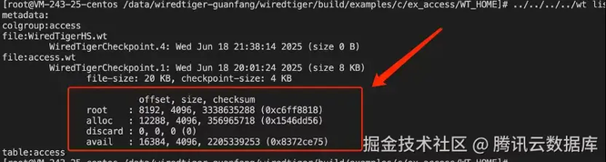 通过 checkpoint 时间点的快照,通过 WiredTiger.wt 元数据文件中的 checkpoint=(WiredTigerCheckpoint.1=(addr="018181e4c6ff67d88281e41546bd168381e48372ae35808080e22fc0cfc0")即可获取 checkpoint 开始时间点的全量数据。