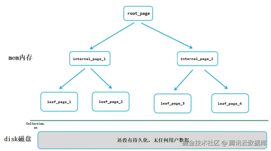 假设以下场景:当用户写数据到 MongoDB 时内存很充足,所有的 KV 数据会存储在 wiredTiger 存储引擎的 B+ tree 中,写入 10 条普通 KV 数据后,因此 wt 的 dirty 指标很低,因此不会触发 B+ tree 的 page evict 操作,写入内存后就会返回客户端 OK ,此时 B+ tree 的数据全部在内存中,还没有持久化。