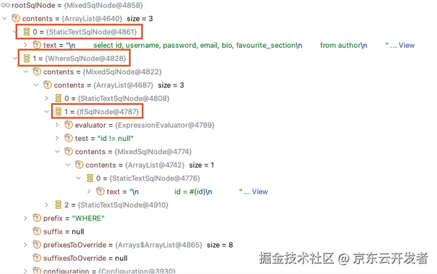 首先它会创建动态 SQL 上下文信息 DynamicContext,这里并不复杂,所以不再追溯源码信息。rootSqlNode 对象在讲解映射配置时我们提到过,它会被解析成 MixedSqlNode 类型,其中包含着各个节点的信息,如下所示:
