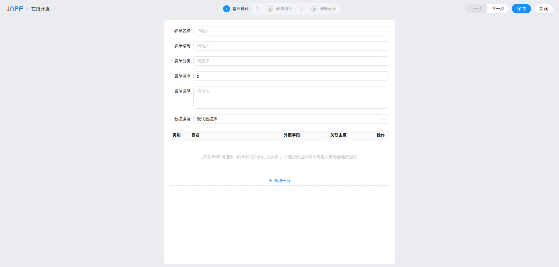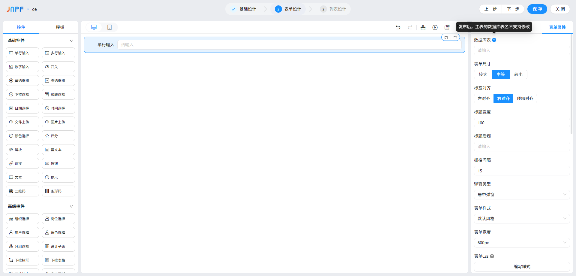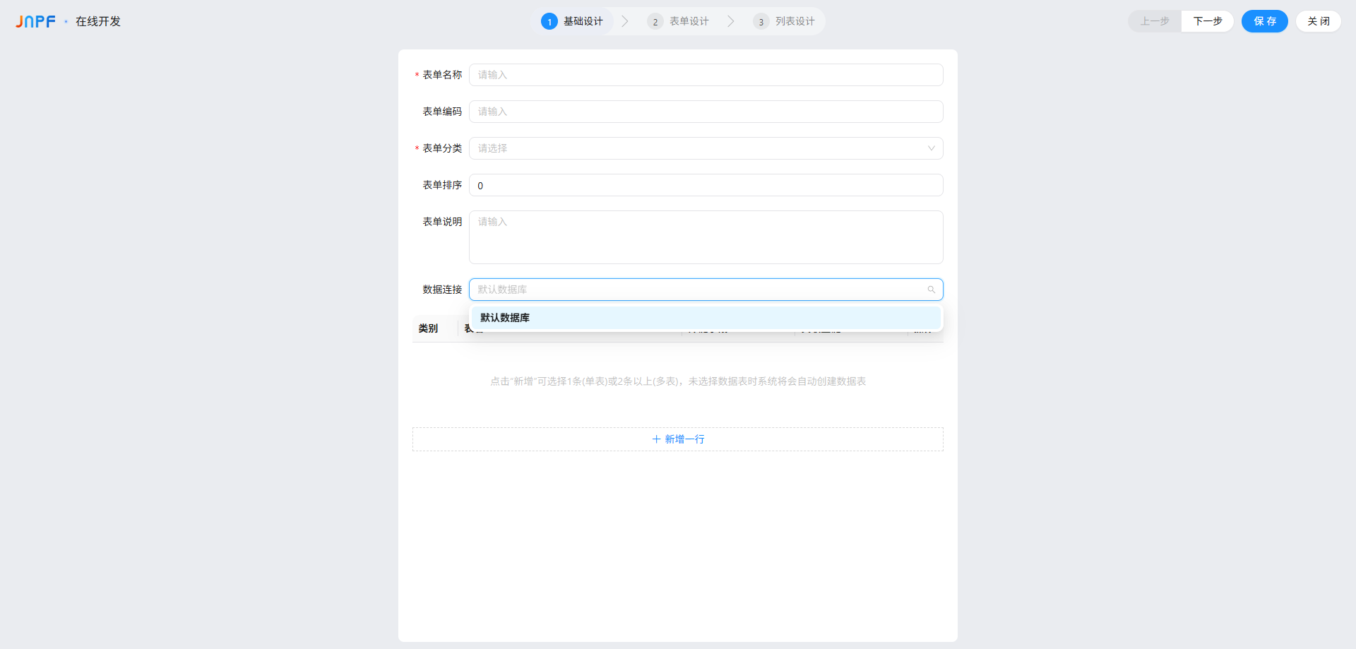 新建表单的完整流程是 “基础设置→表单 / 列表设计→发布”,最关键的是 “基础设置” 中的数据表配置,按步骤拆解如下: