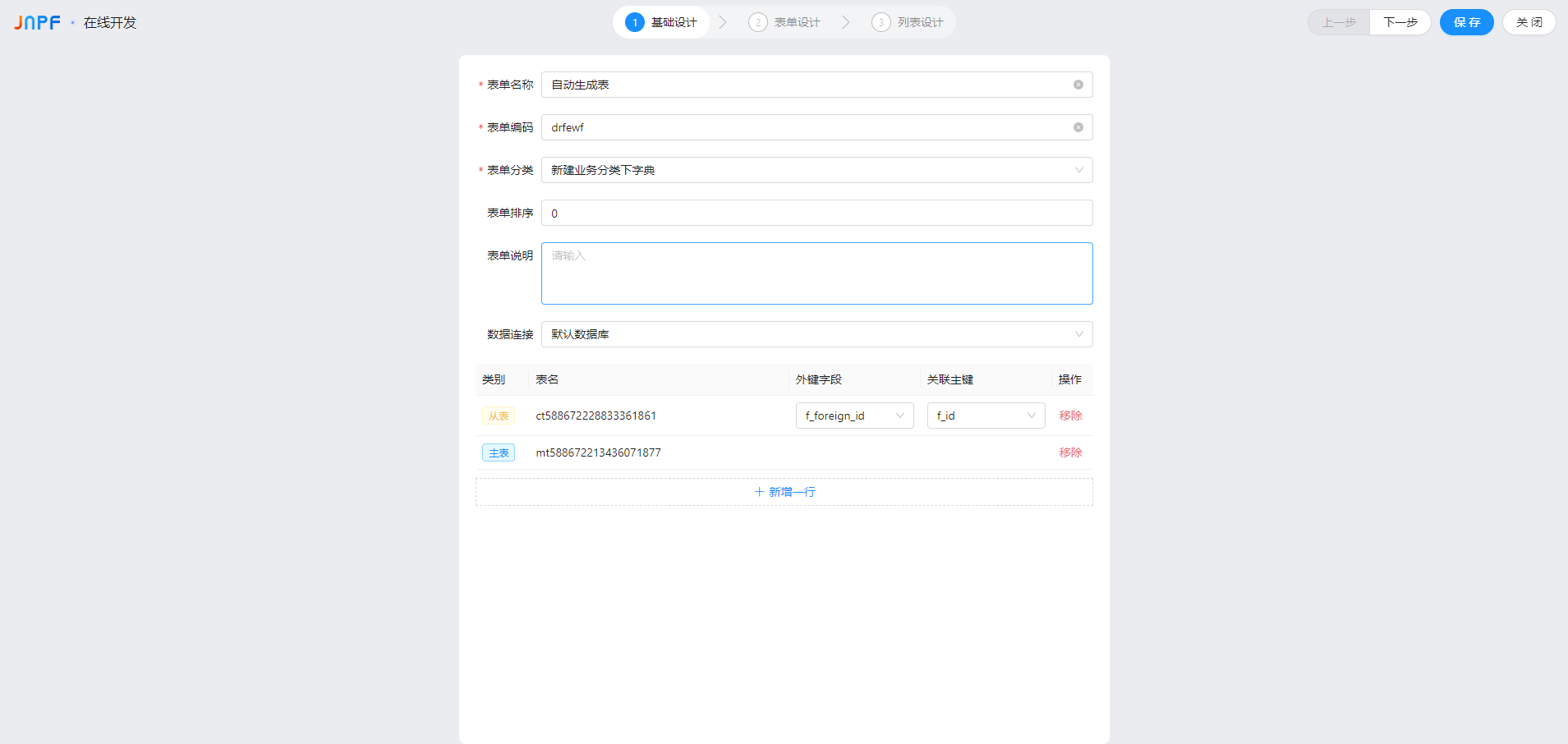 手动选表(适合有现成表,复用数据)确保 “数据连接” 能正常连接(连接失败会提示 “数据库连接失败”,需先排查连接配置);点击 “+ 新增一行”,在弹出的 “数据选择” 窗口中,通过关键词搜索选择现成数据表(如 “ext_order” 订单表),支持多选(多表需配置外键和关联主键);选多表时,要手动指定 “主表” 和 “从表”,并选择对应的 “外键字段” 和 “关联主键”(如主表 “ext_order” 的主键 “f_id” 关联从表 “ext_order_entry” 的外键 “f_foreign_id”),否则无法保存。