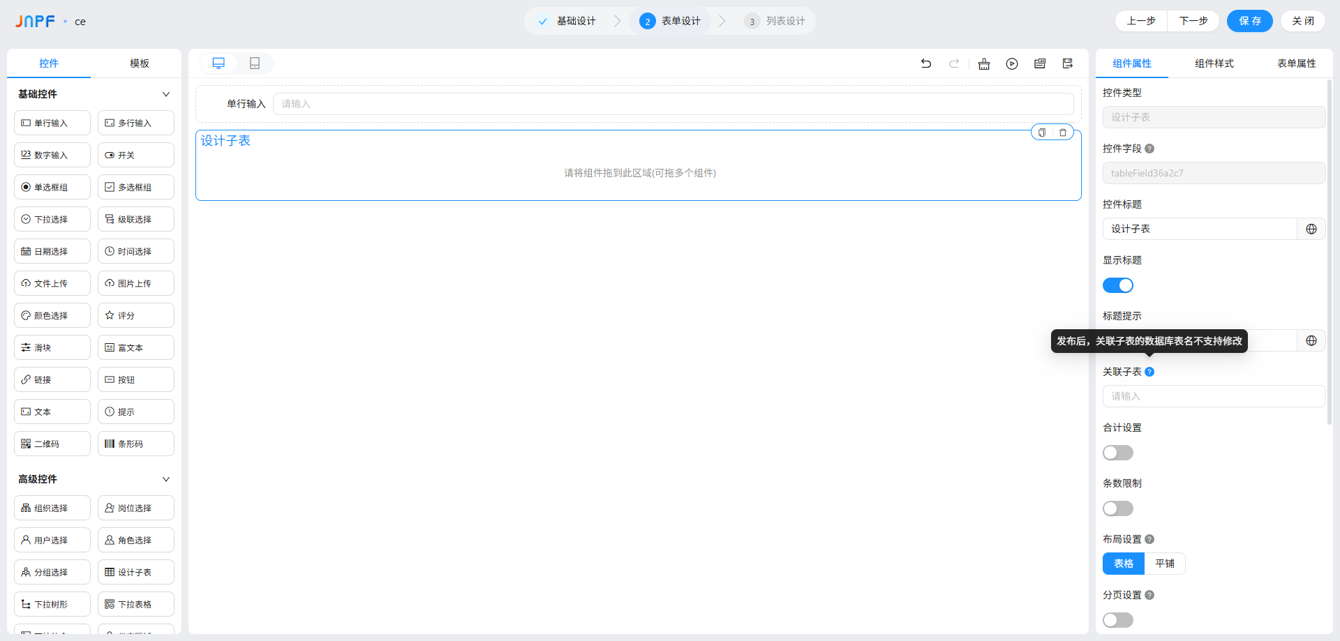 自动生成表后,想改表名怎么办?改不了。发布后系统会锁定主表和子表名,只能删除现有表单,重新创建时在发布前自定义表名。