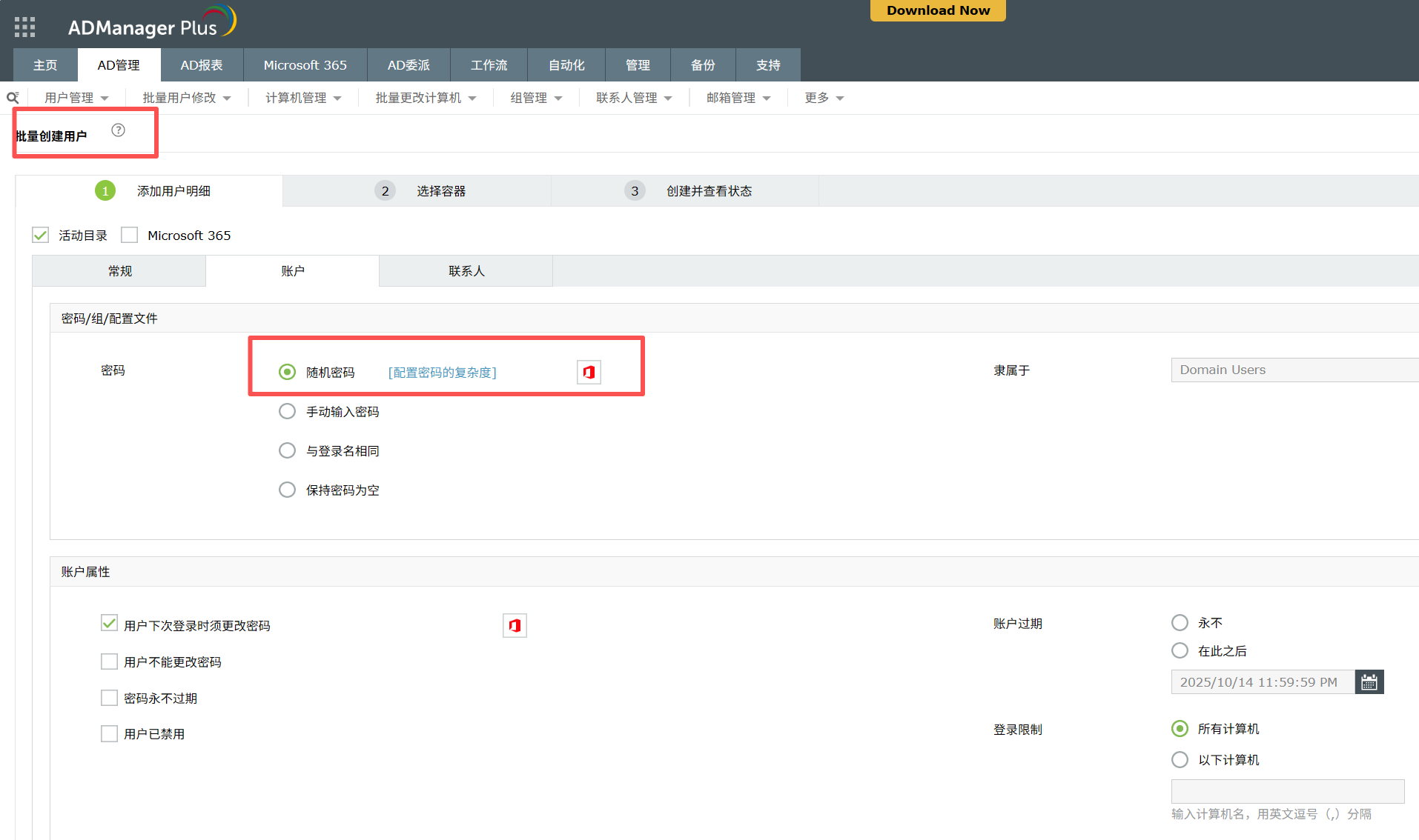 ADManager Plus 作为一款专业的 AD 管理工具,不仅能够帮助管理员轻松创建具备所有相关属性的新用户帐户,更在用户创建过程中提供了随机密码生成功能,为用户帐户安全增添了重要保障。管理员只需按照以下简单步骤操作,即可快速生成安全可靠的随机密码。