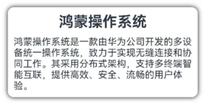 Text('鸿蒙操作系统是一款由华为公司开发的多设备统一操作系统,致力于实现无缝连接和协同工作。其采用分布式架构,支持多终端智能互联,提供高效、安全、流畅的用户体验。')