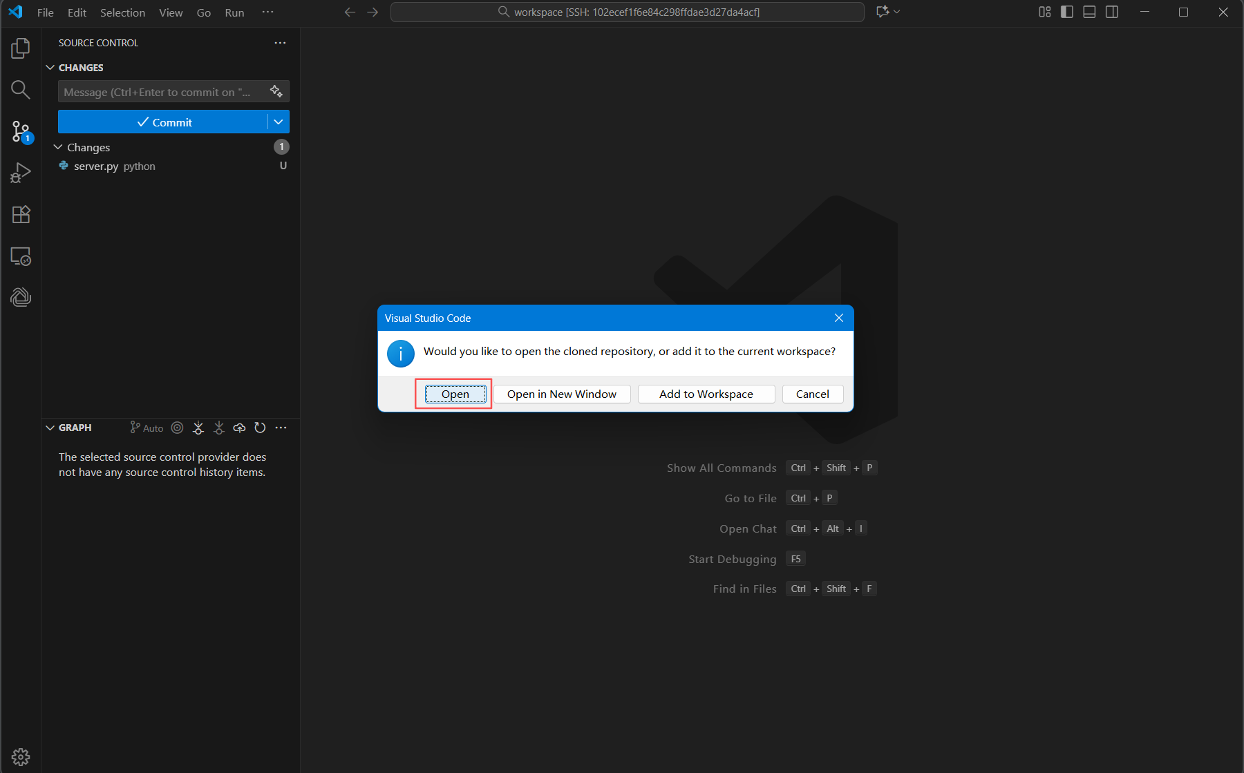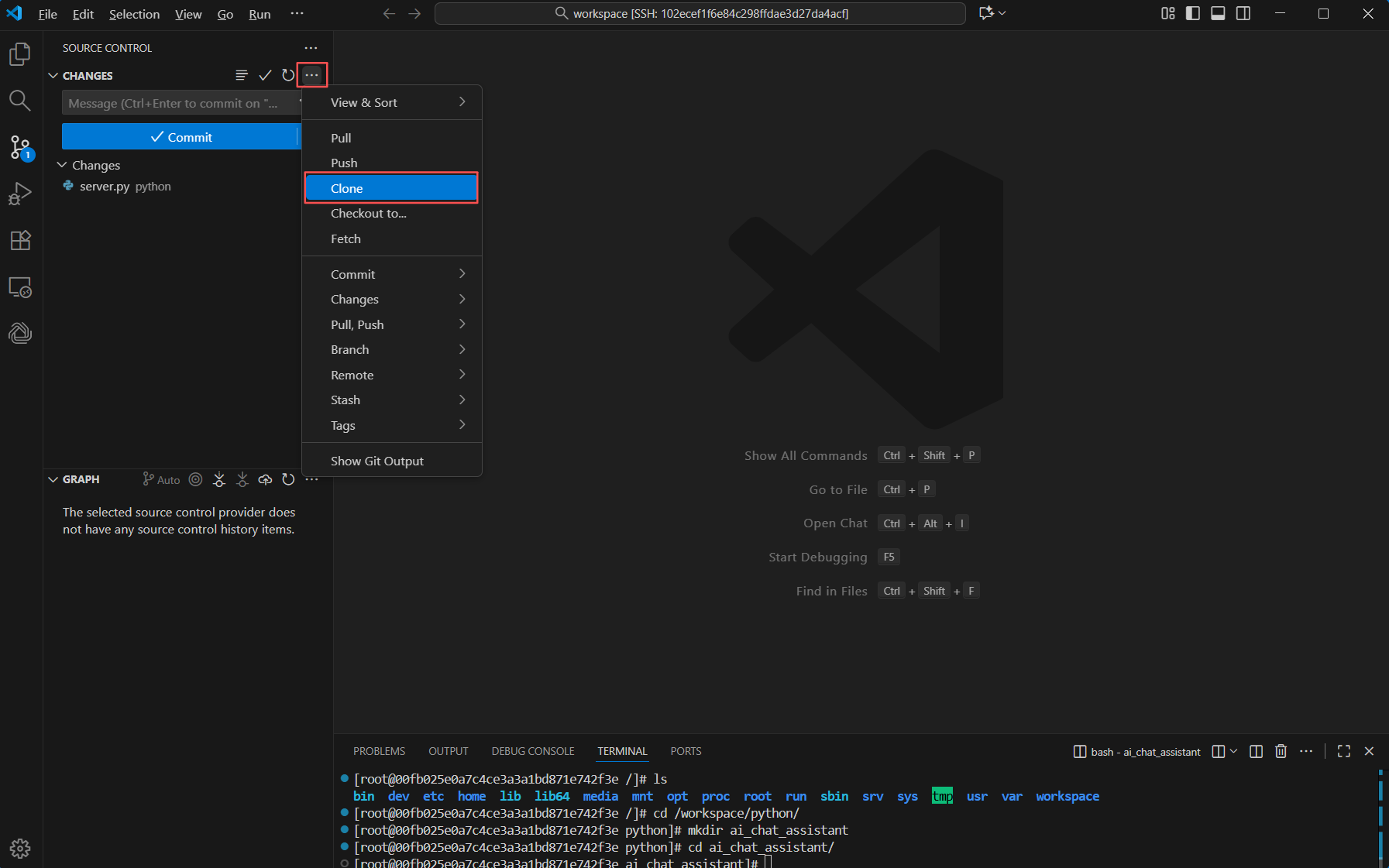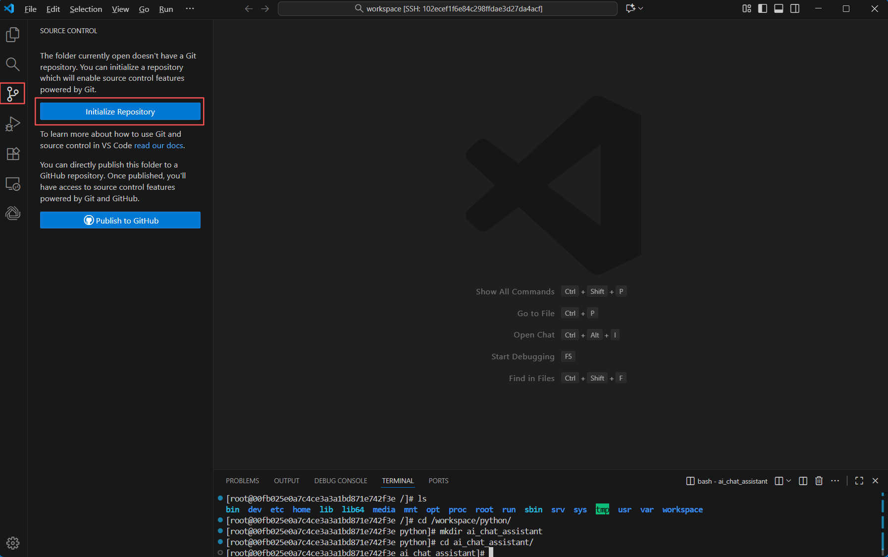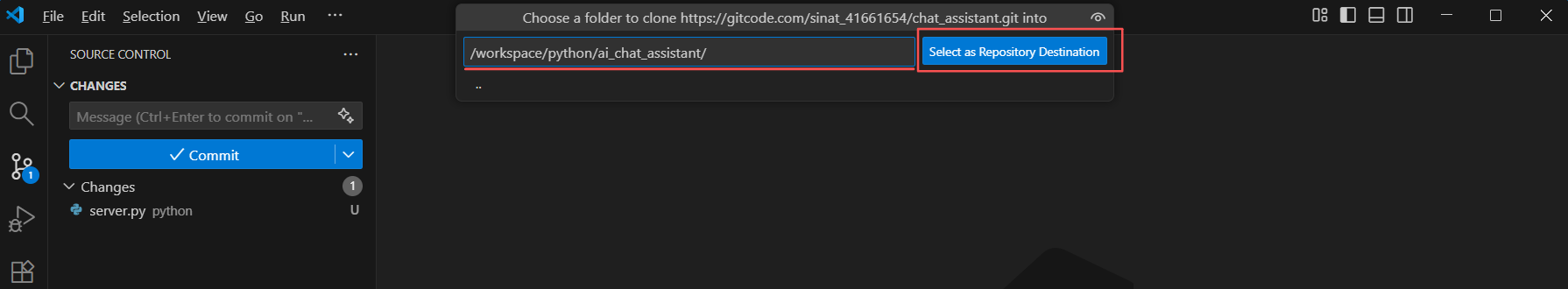 选择代码仓目录:/workspace/python/ai_chat_assistant/,点 Select as Repository Destination。