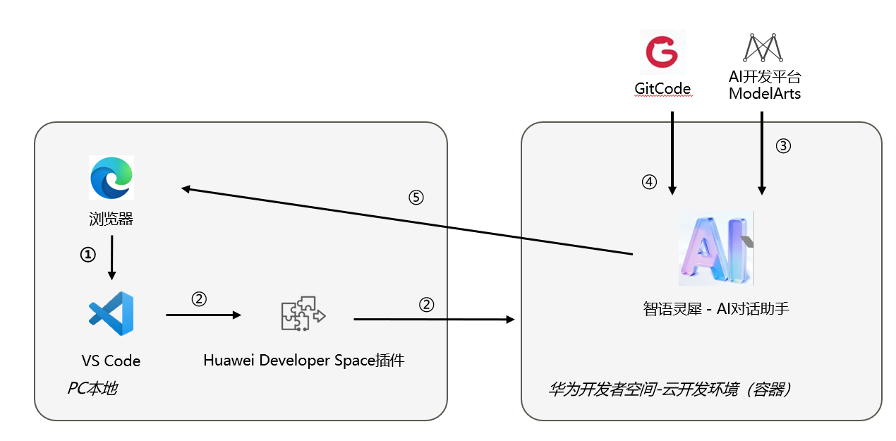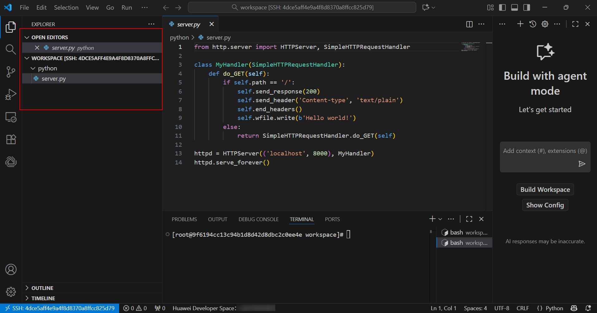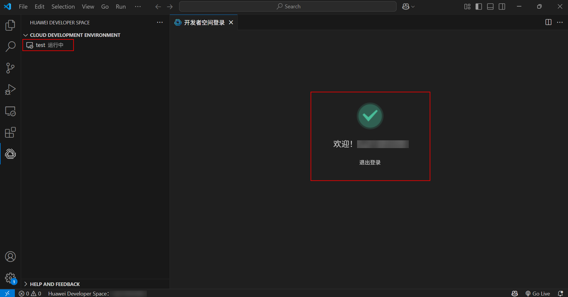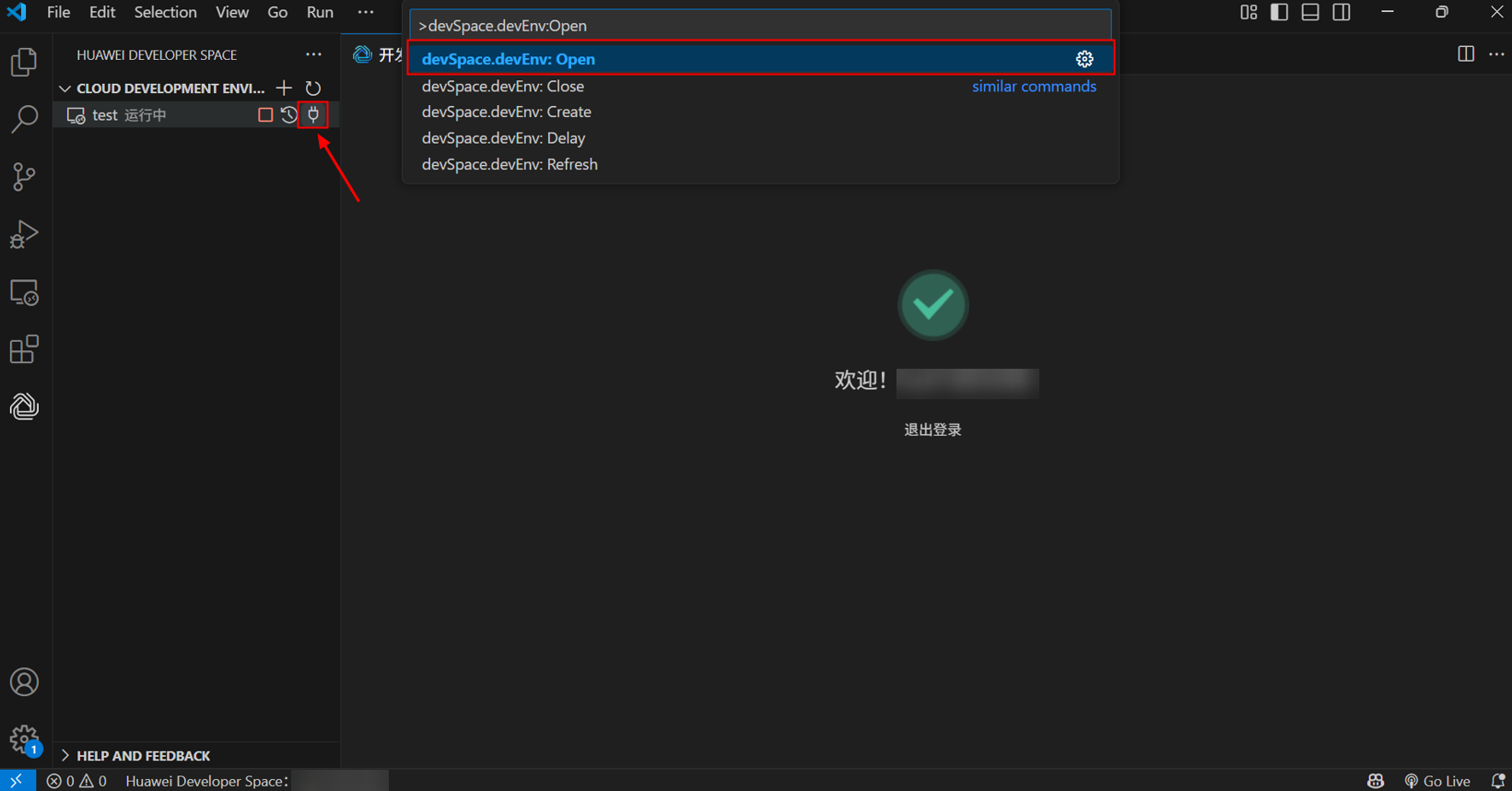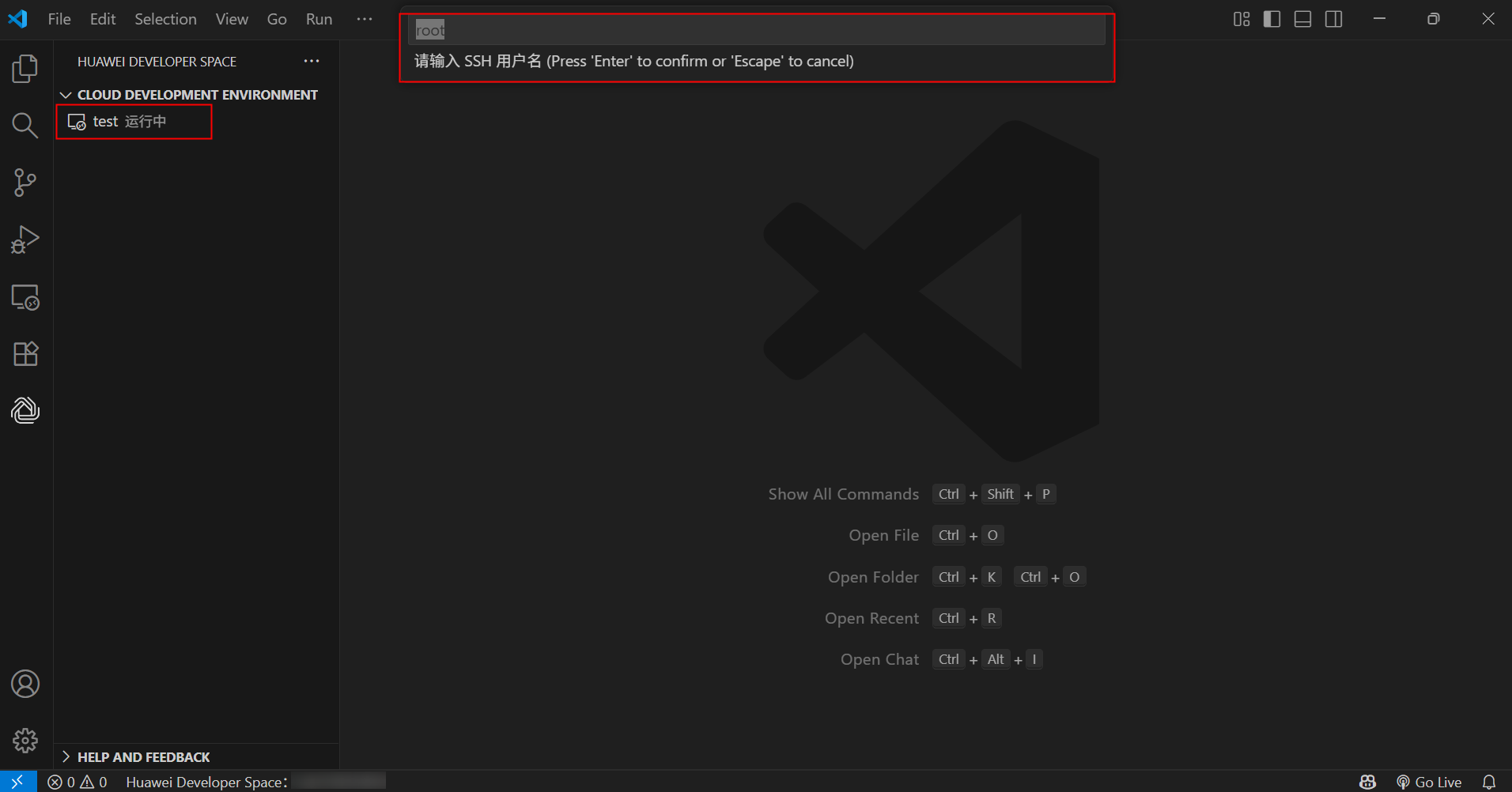 PC 本地通过 VS Code 安装 Huawei Developer Space 插件,远程连接操作云开发环境(容器)的;