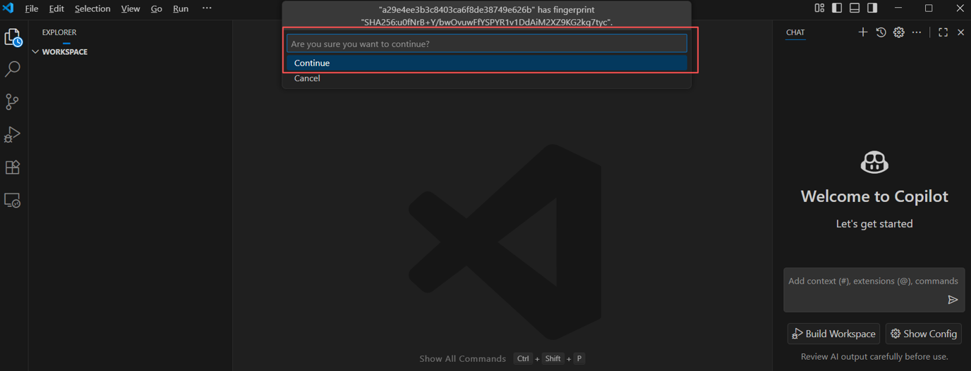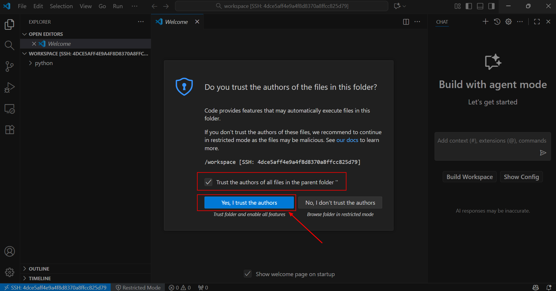 VS Code Server 下载完成之后,弹出弹窗,我们勾选 Trust the authors of all files in the parent folder,然后点击:Yes,I trust the authors。