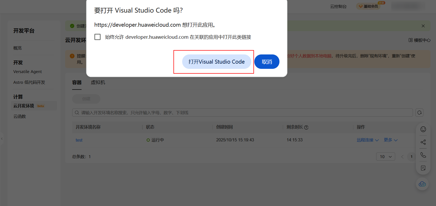 华为开发者空间 - 云开发环境(容器)支持 VS Code 等 IDE 远程连接。在云开发环境(容器)“test”操作栏点远程连接 > VS Code。
