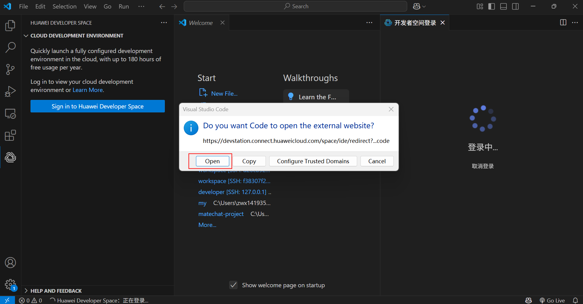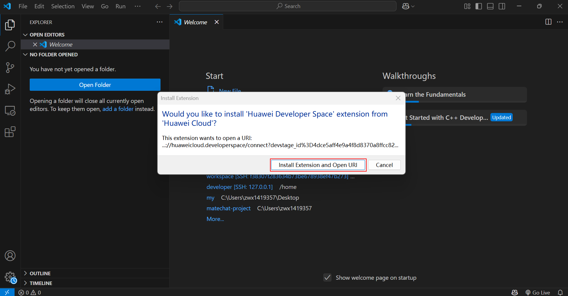 打开 VS Code 后,提示安装 Huawei Developer Space,点 Install Extension and Open URI。