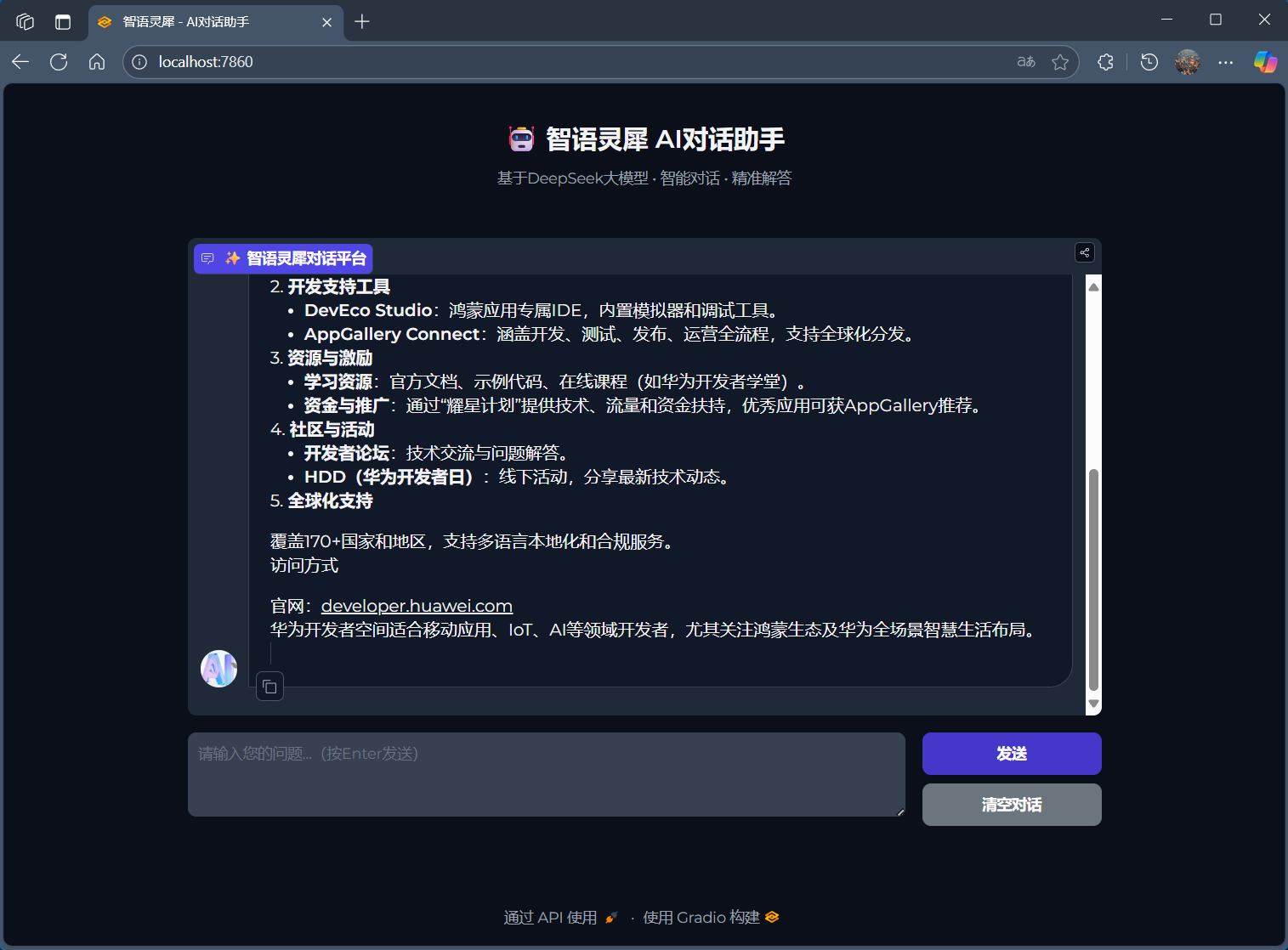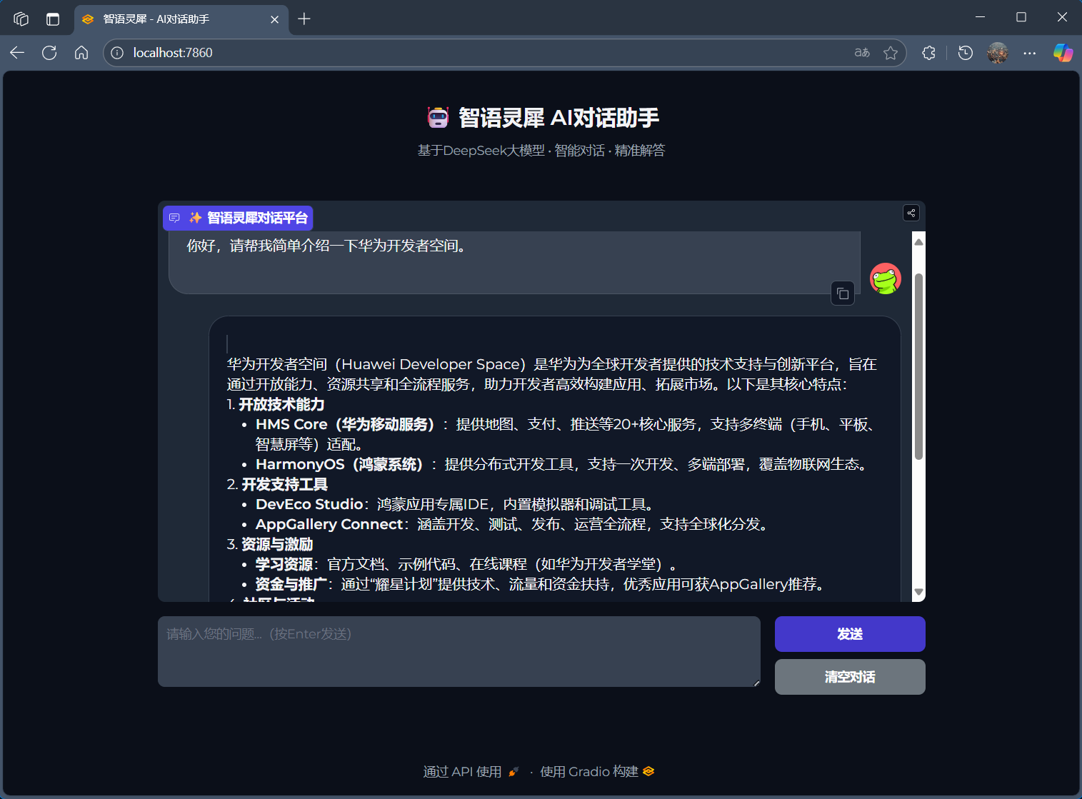 AI 智能对话助手技术架构上,项目采用 Python+Gradio 技术栈,基于华为 MaaS 平台的强大算力支持,实现了高性能的智能对话服务。