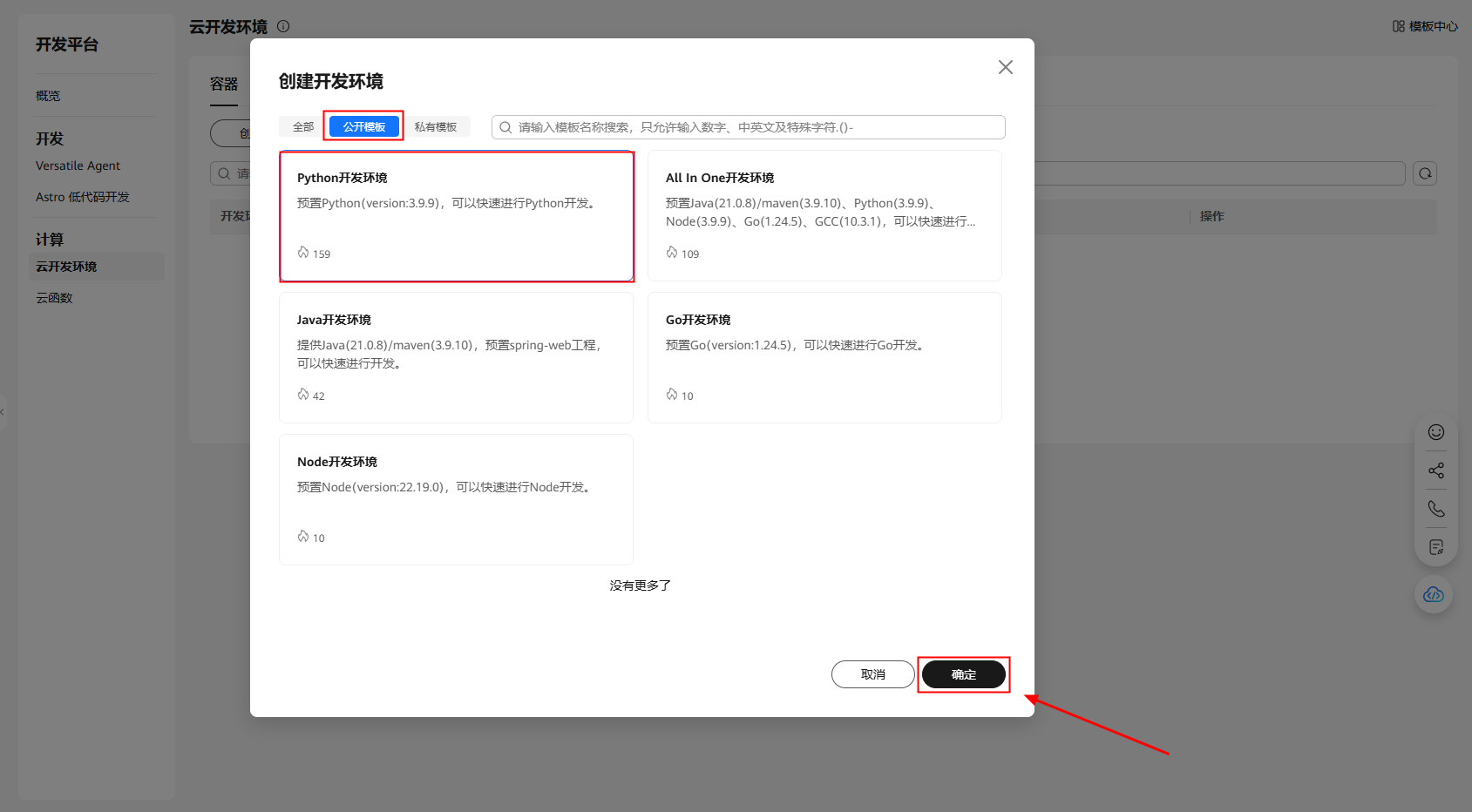 以公开模板中的 Python 开发环境为例,这里对其进行选中,点右下角的确定。