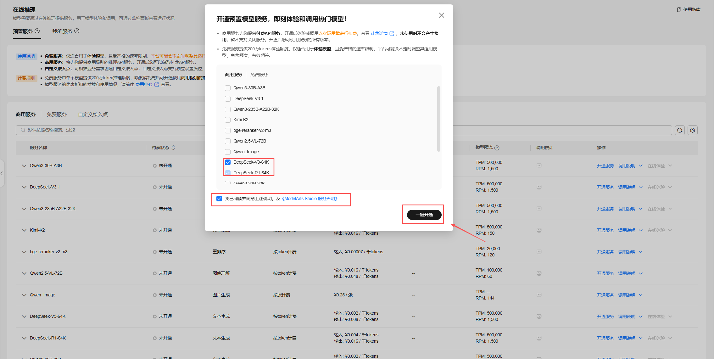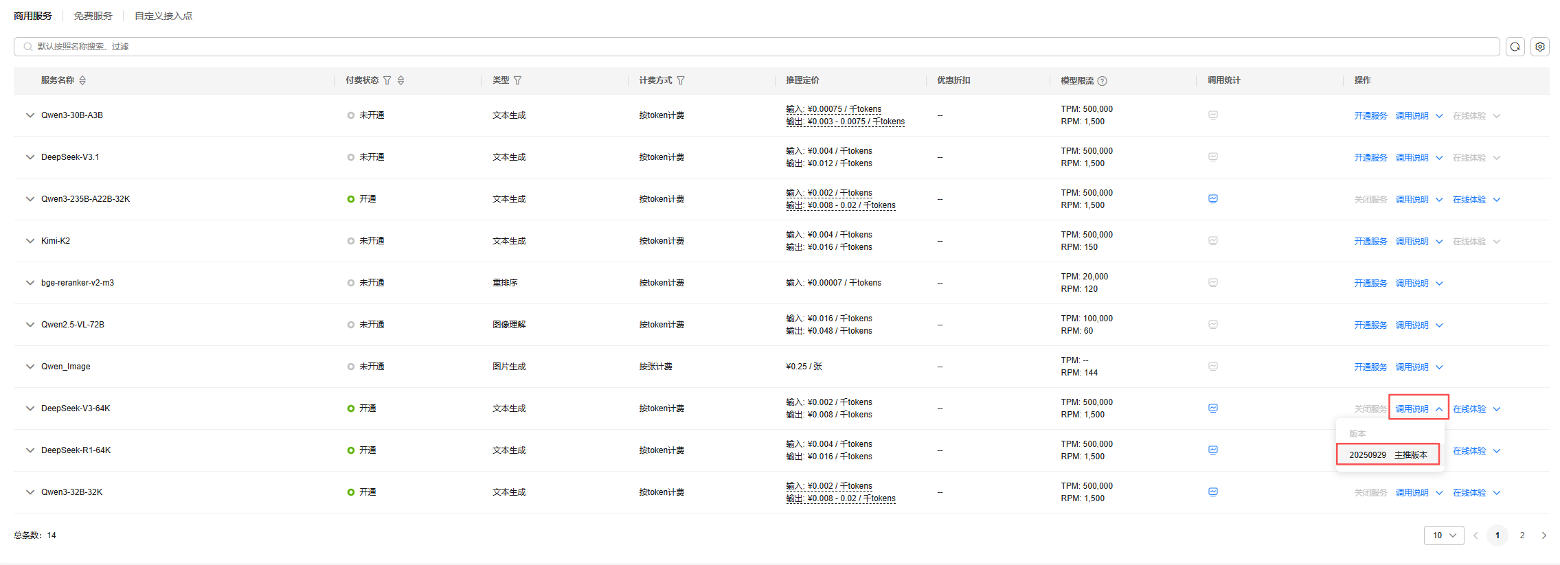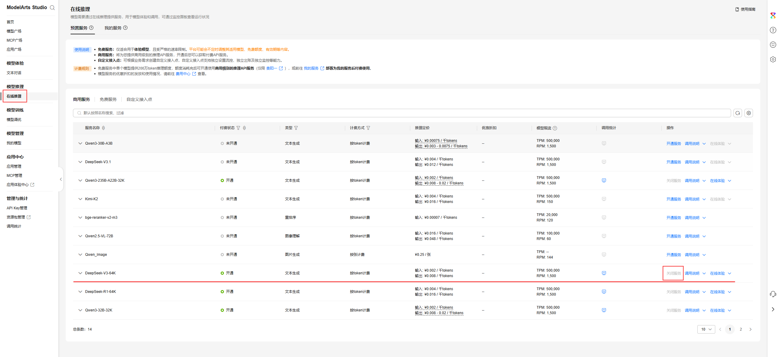 进入MaaS控制台页面,左侧导航栏点模型推理 → 在线推理,右侧预置服务 → 商用服务页签,在下侧的商用服务列表中找到 DeepSeek-V3-64K,操作栏点开通服务。