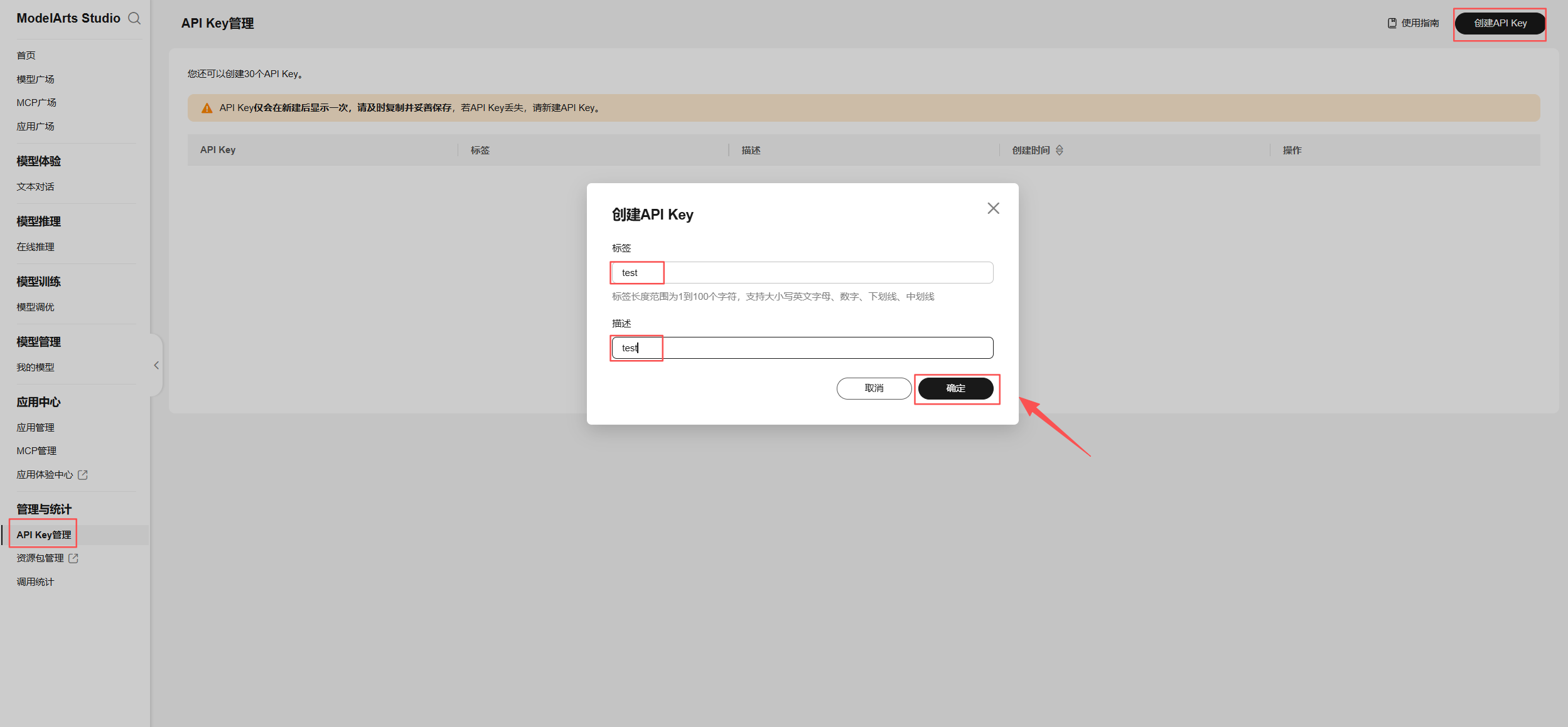 在 API Key 管理页,点右上角创建 API Key。在弹出的配置弹窗中,标签和描述可以自定义,输入完毕后点击确定。