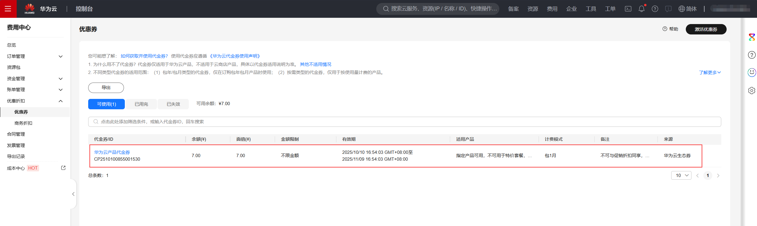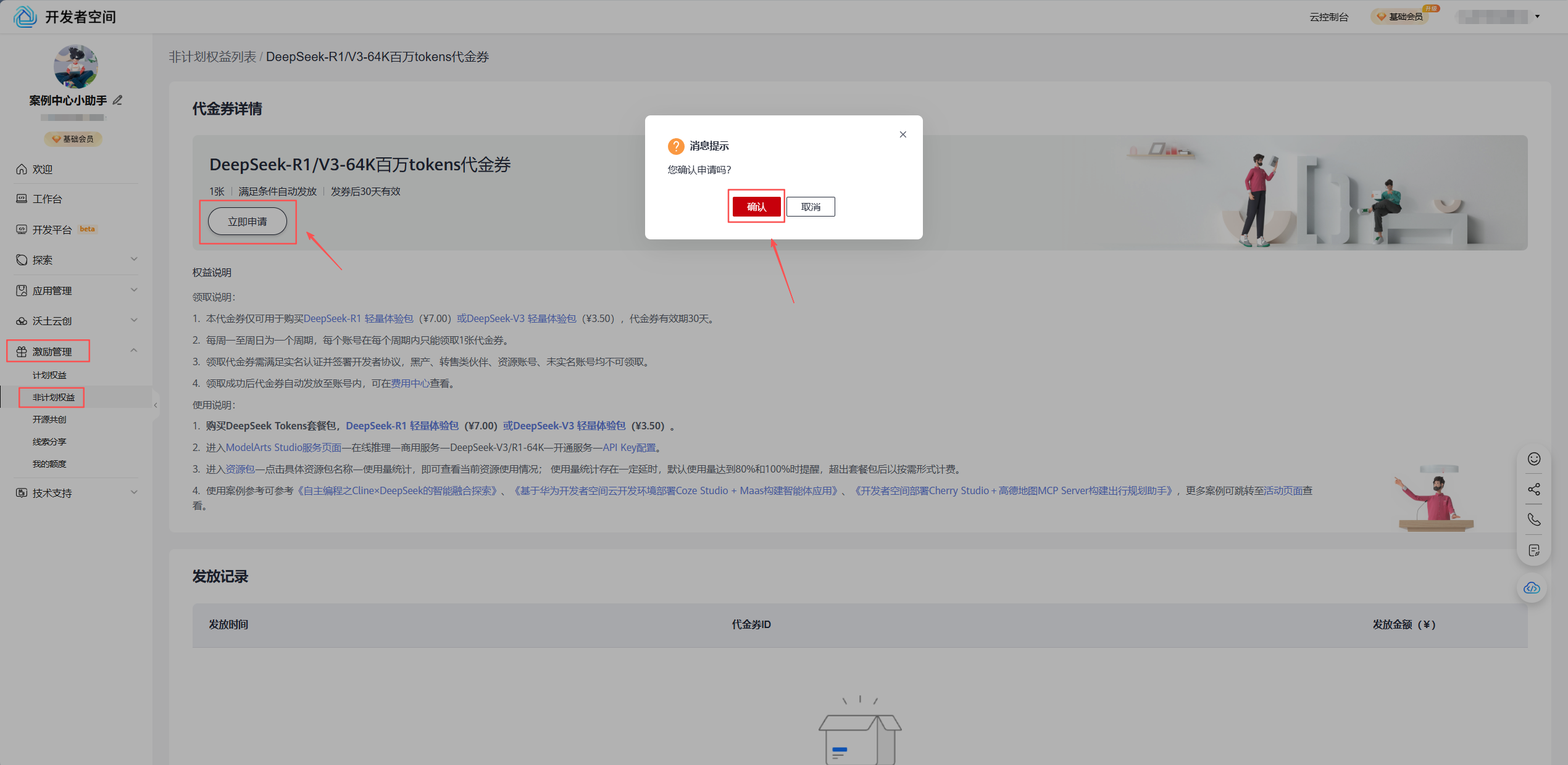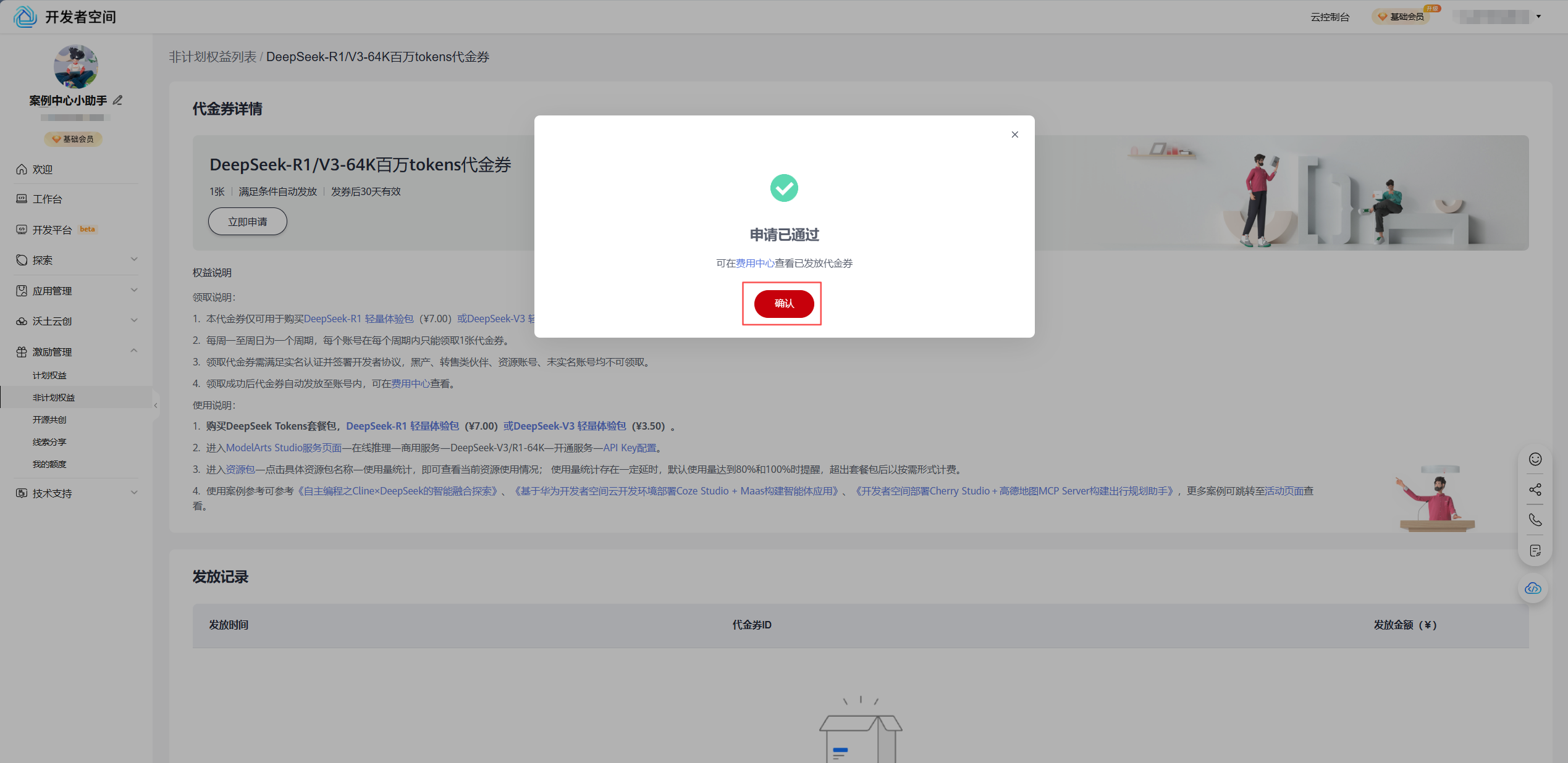 华为开发者空间为开发者带来百万 token 代金券福利,点击领取链接按照指引进行代金券的领取和套餐包的购买。