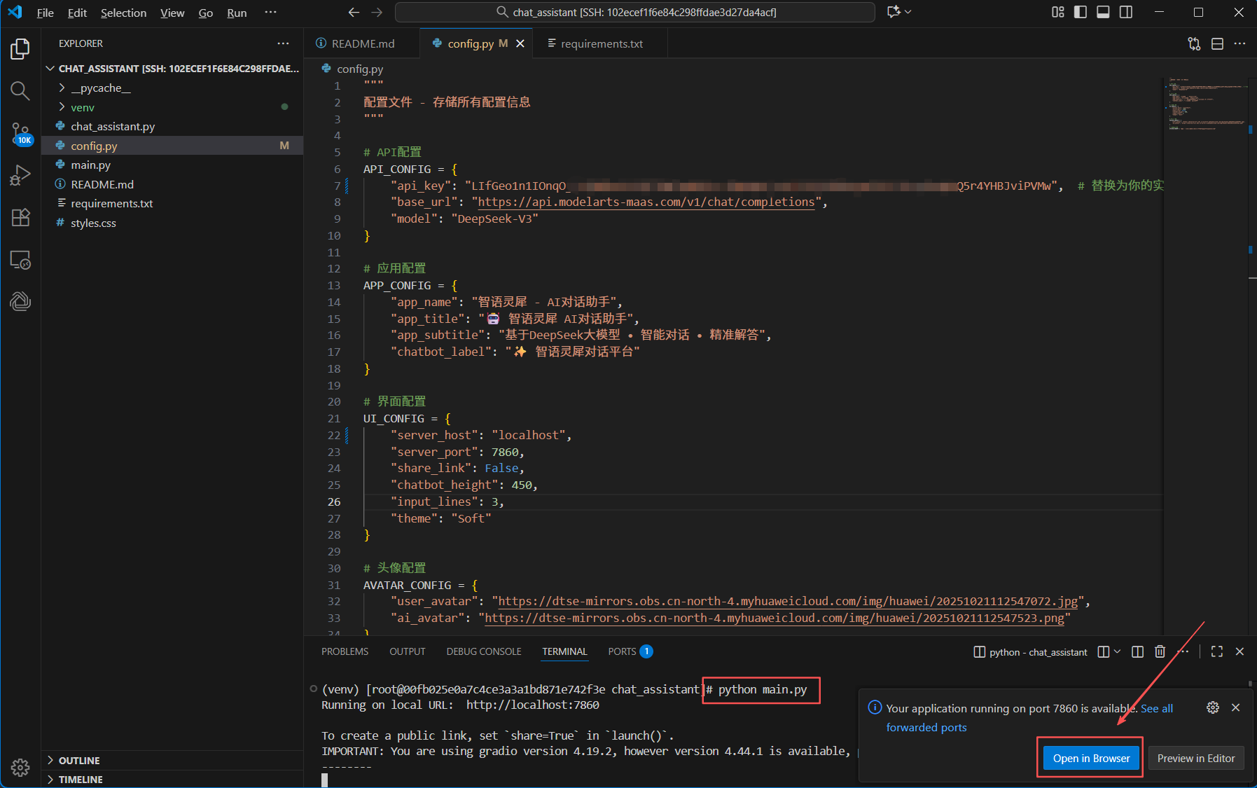 在 VS Code 终端窗口中运行如下命令,启动智语灵犀 - AI 对话助手。