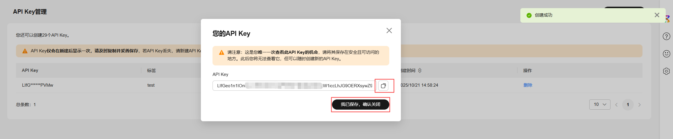 注:这是唯一一次查看此 API Key 的机会,请将其保存在安全且可访问的地方。此后将无法查看它,但可以随时创建新的 API Key。
