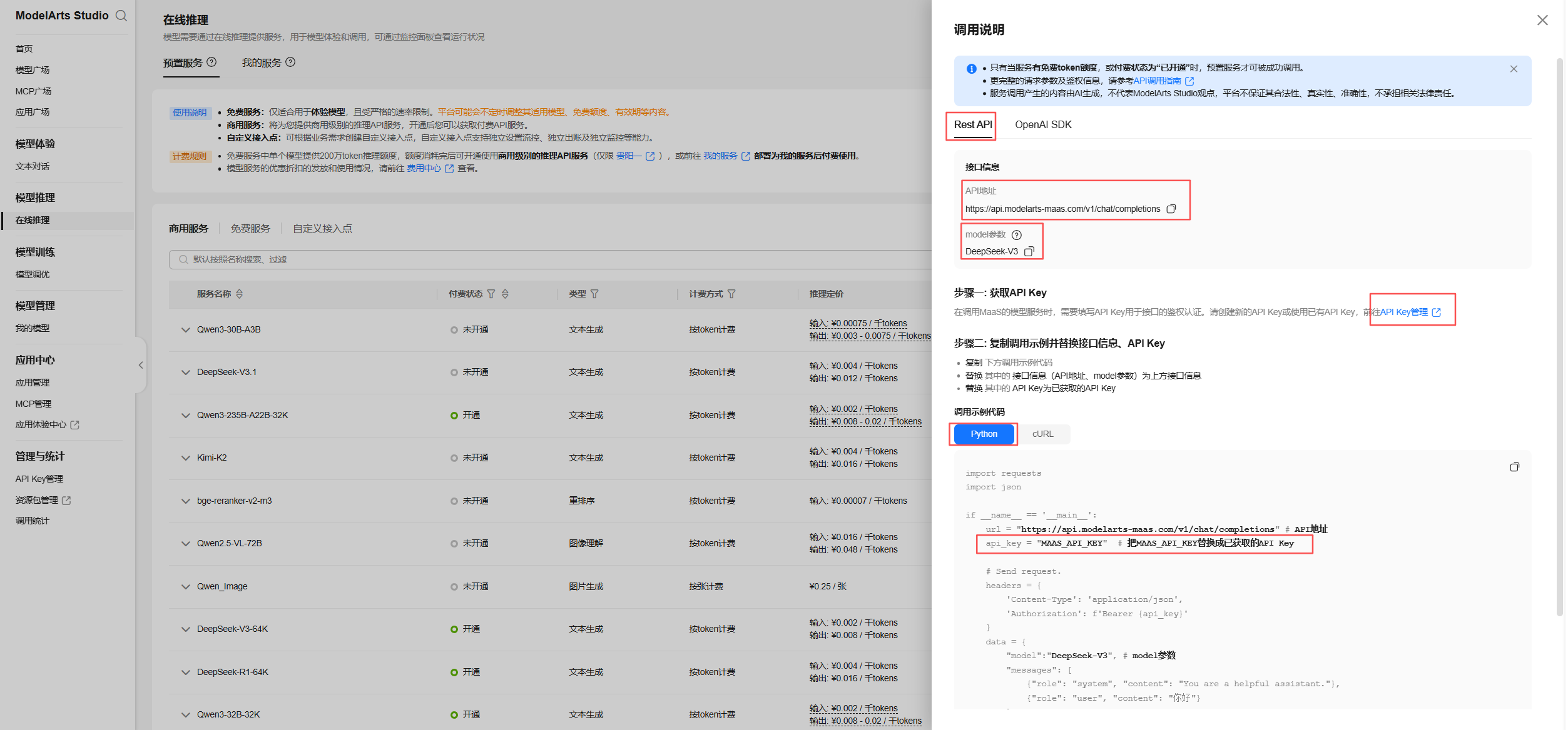 Rest API 页签可以得到 API 地址、model 模型两个关键参数以及 Python 调用示例代码。