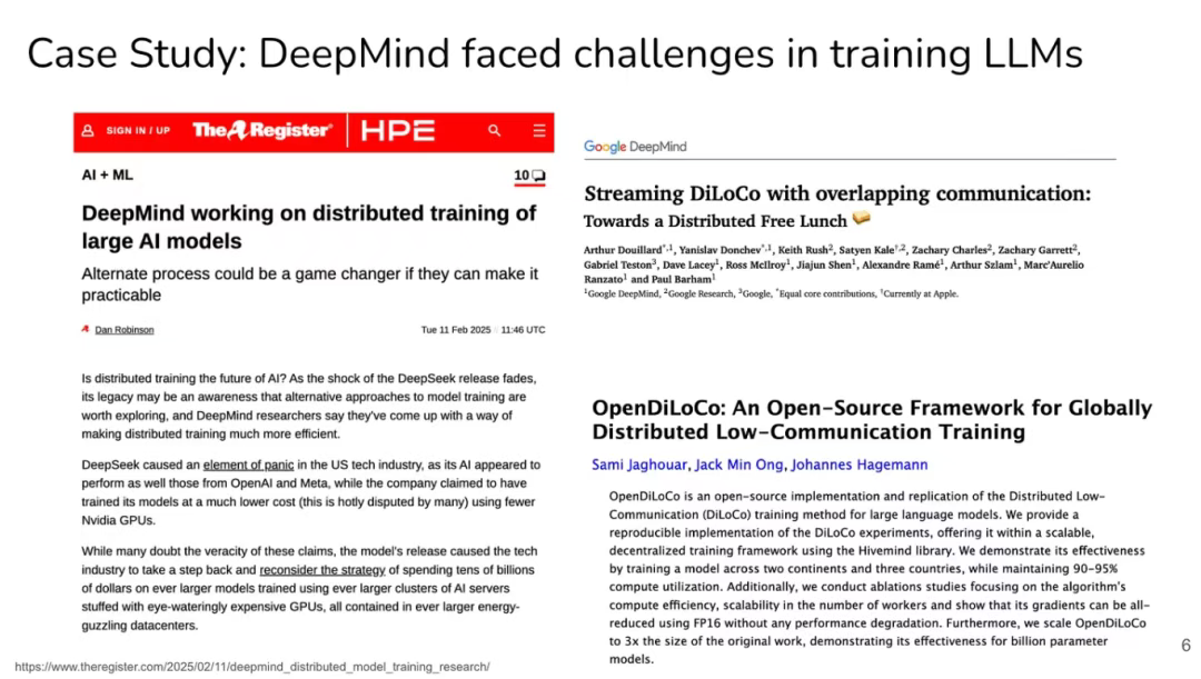 TLDR:DeepMind 报告称,即使拥有数千块 GPU,分布式训练仍会卡顿,因为少数慢节点拖慢了全局同步。在数据并行训练中,整个任务必须等待最慢的那个工作节点。Ray 和 Kubernetes 通过弹性管理(节点故障时重新分配任务)和调度优化(避免 GPU 在队列中闲置)来缓解这类问题。