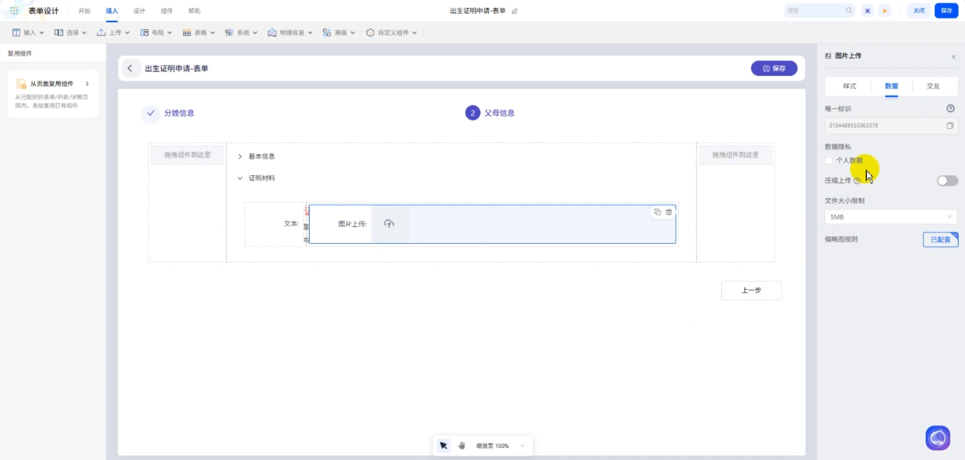 针对图片上传组件,我们可以设置上传的文件大小、文件格式、以及缩略图的展示规则,方便用户在提交前再次确认文件内容是否正确。