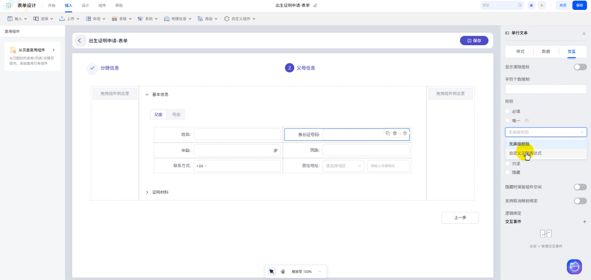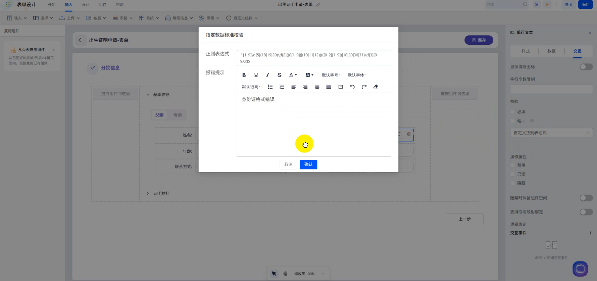 为了避免用户输入错误的身份证号格式,我们可以为组件添加正则表达式校验规则。