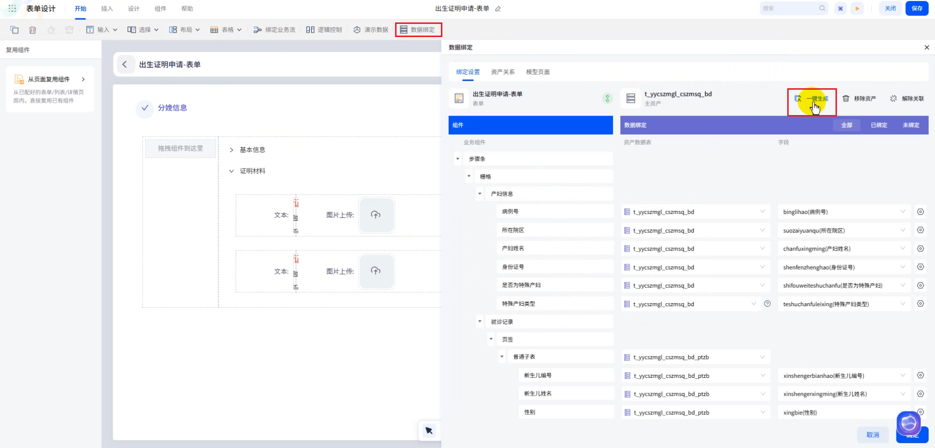 表单填写完成后,需要将数据存放至数据表中。我们点击数据绑定按钮,选择一键生成,系统便会自动生成与表单相符的数据模型,完成数据绑定工作。