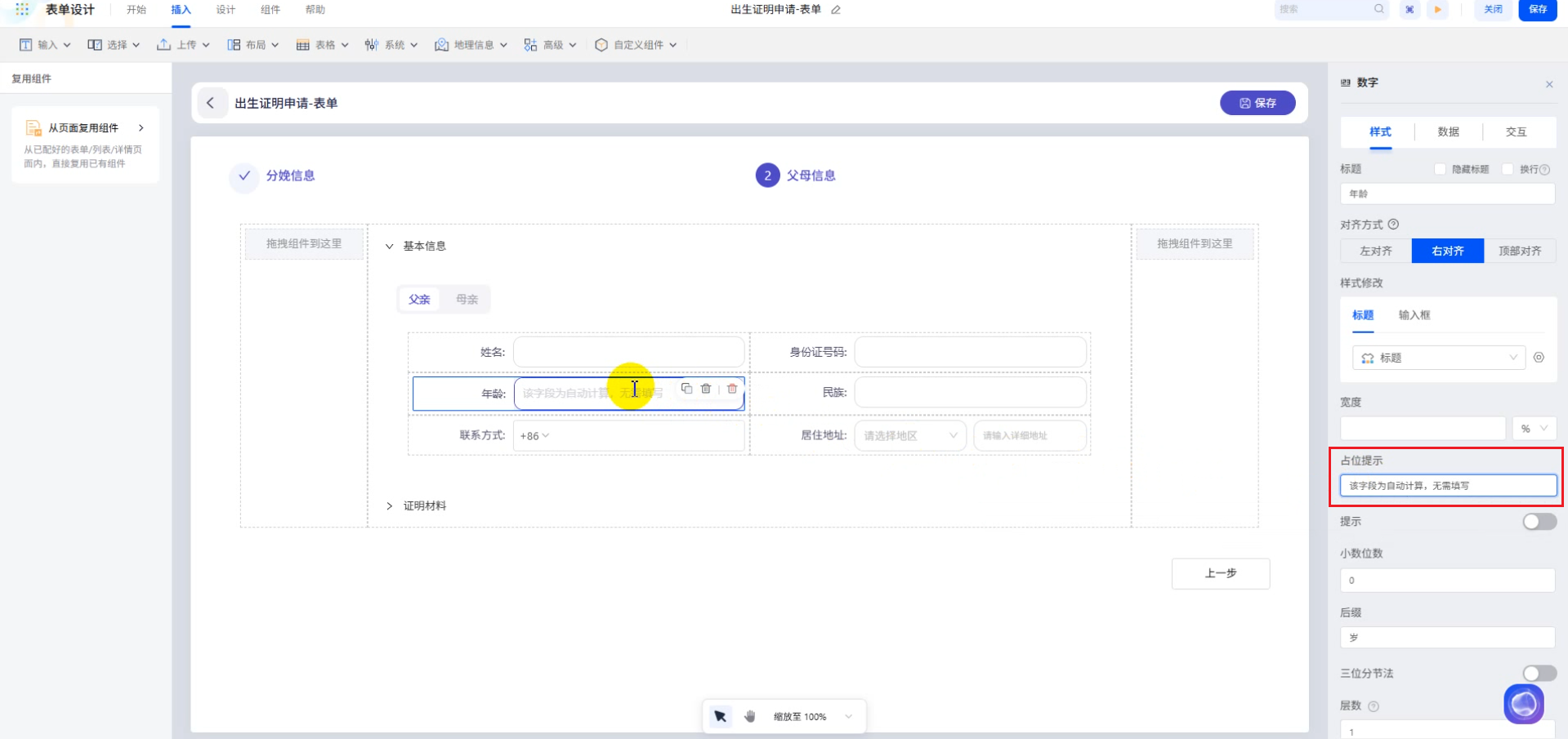 在实际场景下,用户输入身份证号后,应该自动计算出年龄。我们可以为身份证组件添加交互逻辑,当用户输入身份证号后,系统获取生日信息,并进行计算,最终将计算结果赋值年龄组件。