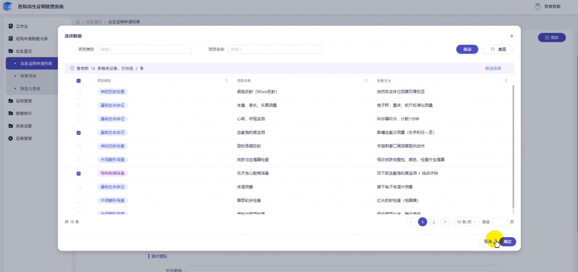 就诊记录模块用于系统化记录新生儿的基本情况和产妇的检查项目。该模块信息量大、数据类型多样,我们采用页签布局将其分为“新生儿信息”和“检查项目”两个子模块,以实现内容的清晰分类与高效填写。