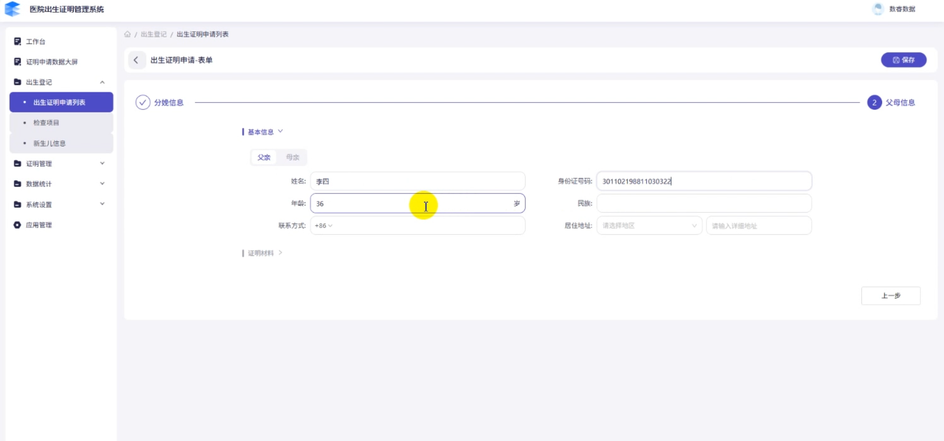 父母信息模块作为出生证明登记的第二步骤,负责收集父亲和母亲的基本信息及相关证明材料。该模块涉及个人信息量大、敏感度高,且部分字段需要严格的格式校验。我们采用折叠面板与页签布局相结合的方式,在保证信息完整性的同时,确保界面清晰、填写便捷。
