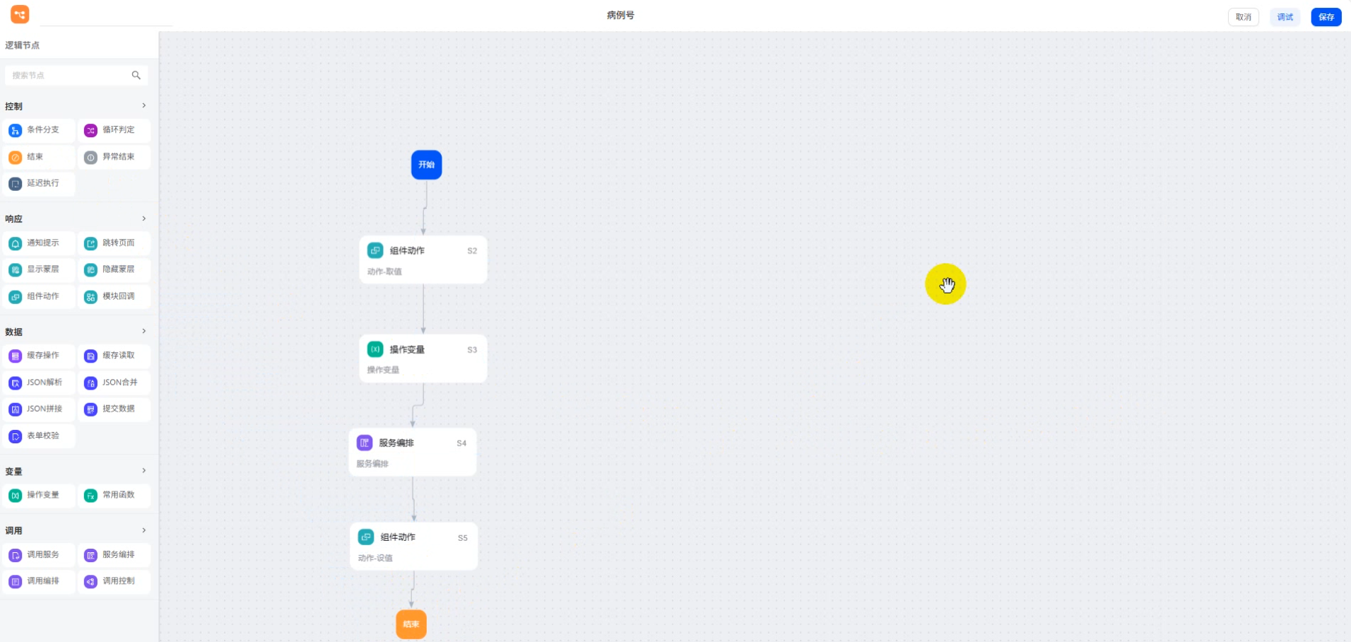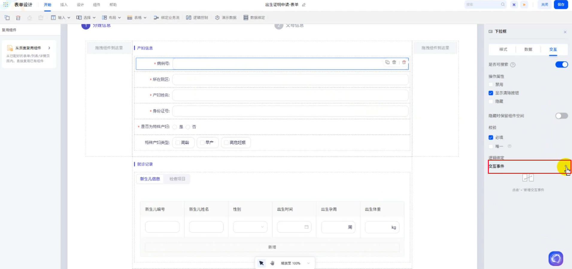 我们选中病例编号组件,配置交互事件,当选中选项后,系统将病例编号作为查询条件,在【新生儿信息】资产中查找相应数据,并填充至新生儿列表中。