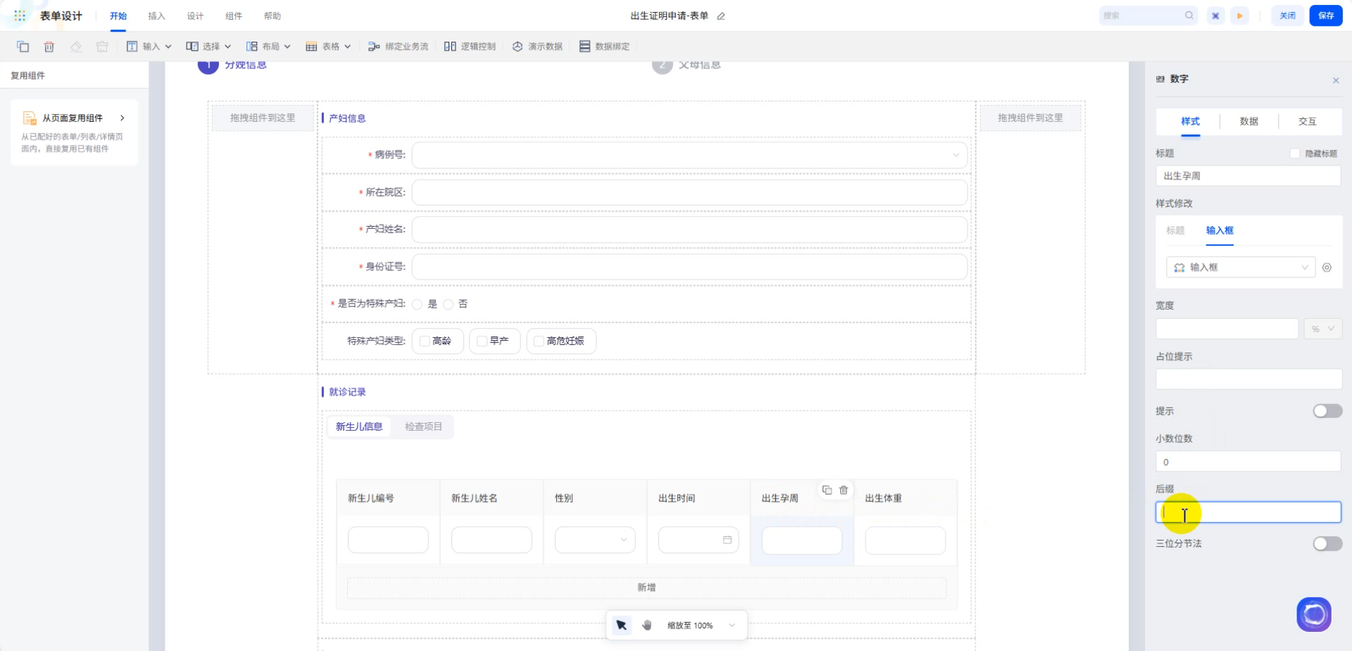 • 出生孕周(数字组件):在组件后缀中输入“周”。
